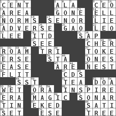 ACROSS 1. Penny 5. According to 8. Corporate head (abbr.) 11. Length times width 12. Went 14. Pipe bend 15. Typical models 17. Sir (Sp.) 18. Whopper 19. Contrary to your interests or welfare 21. E Mali city 22. Lion 23. Area sheltered from the wind 24. It would 25. Plant excrement 27. Perceive with the eye 28. "Mermaids" star 31. Wander aimlessly 35. Three (prefix) 37. Puff or smoke 38. Celtic language 39. R.R. building 41. Washington bills 42. Comfort 43. "We ___ not amused" (Victoria) 45. A home for chicks 46. Secret move to avoid paying debts 47. Music discs 49. Fast jet (abbr.) 51. Beverage made from leaves 52. ___ good deed 55. Dripping 57. Mouth or opening 60. Motivate 62. Epoch 63. Mysterious quality of enchantment 65. Underwater navigation system 66. Shallow baking pan 67. Supplemented with great effort 68. Suttee (variant) 69. Arrange properly for use 70. Compass dir. 71. Family _ (genealogy) DOWN 1. Lessep's creation 2. Wear away 3. Effrontery 4. Docile 5. Personal question 6. Protracted 7. Small Philippine buffalo 8. Portable communications device 9. Writer Wiesel 10. Margarine 13. Greek god of love 16. Indian titles of respect 17. Spring feasts 20. Proofreading order 26. NE Massachussets city 29. Makes supply last 30. Take ten 31. Coral collection 32. Of the mouth 33. Aide 34. Confronts 36. Call ___ day 40. Northern region 44. Locale of original sin 48. Backtalk 50. Heavy book 52. Middle Eastern gold or silver currency 53. Speak pompously 54. Nest on high 55. Soaks 56. 4th largest of the Great Lakes 58. Libertine 59. Grows older 61. Mail 64. Binary compound