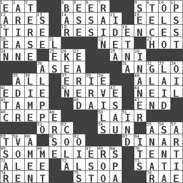 ACROSS 1. Erode 4. Fermented drink made from hops 8. Discontinue 12. Ancient Greek god of war 14. Slender Brazilian palm 16. Snakelike fish 17. Hoop that covers a wheel 18. Dwellings 20. Artist's stand 22. Fish or hair follower 23. Being at a high temperature 24. Compass dir. 25. Supplement with great effort 28. Cuckoo 30. At sea 31. White American of non-Hispanic descent 35. Everything 37. 4th largest of the Great Lakes 40. Jai _ 41. Singer Brickell 42. Effrontery 44. Famous astronaut Armstrong 45. Pack (down) 46. Raised platform 47. Conclusion 48. Streamer paper 50. Den 52. The grampus (Milton) 54. Player for Phoenix 55. White ___ sheet 58. Federal power corp. 61. "Barney Miller" actor Jack 63. Middle Eastern gold or silver currency 65. Wine waiters 70. Portable shelter 71. Toward shelter 72. Columnist Joseph or Stewart 73. Suttee (variant) 74. Monthly bill 75. Portico 76. Actress Charlotte DOWN 1. Eroded 2. Believer in; advocate of (suffix) 3. Laconic 4. Tavern 5. Compass dir. 6. Curvy letter 7. Precipitation 8. Elected rep. 9. Georgia ____ (Atlanta school) 10. Butter sub 11. Inconspicuous attention getter 13. Perceive with the eye 15. The content of cognition 19. Inactive volcano in Sicily 21. French article 26. Peachy ____! 27. Having ears or earlike features 29. More empty; more void 30. City in Syria 32. Small, secluded valley 33. Put down 34. Petroleum 35. The sixth month of the Jewish calendar 36. Welles in "The Third Man" 38. Retirement account (abbr.) 39. Vices 41. And so on (abbr.) 43. Son of Isaac 49. Celtic language 51. Working for oneself (abbr.) 53. Root beer relative 55. Approach 56. Before Barbara or Clara 57. Nick name for Arthur 58. Russian ruler of old 59. Grand slam 60. So be it 62. Lubricates 64. It is 66. Was introduced to 67. Eastern Standard Time (abbr.) 68. Friend of Pooh 69. Health resort
