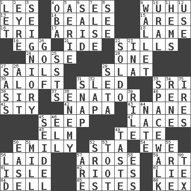 ACROSS 1. French article 4. Fertile tracts in a desert 9. Chinese city south-southwest of Nanjing 13. Sight organ 14. Memphis, Tenn. Street 15. Ancient Greek god of war 16. Three (prefix) 17. Get up 18. Unable to walk 19. Ovum 21. Binary compound 22. Beverly of Met fame 24. Olfactory organ 26. Single 27. Moves on water 29. Narrow board 30. Upward 31. Downhill vehicle 33. Indian title of respect (Mr.) 36. Title for a knight 37. Legislator 40. For each 41. Filthy place 42. California wine valley 43. Empty; void 45. Ooze 47. Shoestrings 48. Shade tree 49. Wig 50. Poet Dickinson 52. R.R. building 54. She-sheep 56. Put down 57. Came up 59. Nonscientific branch of learning 61. Small island 62. Debaucheries 63. Untruth 64. Small valley 65. _____ Park, CO 66. A weed DOWN 1. Allow 2. Jane of fiction 3. Signiory (variant) 4. Chief or king in Benin or Nigeria 5. Nest on high 6. Alleged 7. Otherwise 8. Perceive with the eye 9. Place for singles 10. Mountain range 11. Cloth borders 12. Purpose 20. _ course 22. Twentieth part of a lira 23. _ tizzy (2 wds.) 25. Fast planes 27. Backtalk 28. Set down 29. Stalk of a moss capsule 31. Fastener 32. Pet locale 33. High altitude stroll 34. French philosopher Descartes 35. Angers 38. Foe 39. Cause heat under the collar 44. Nathan's nickname 45. Beer mug 46. Pipe bend 49. Clothes sense 50. Comfort 51. Place where flour is made 52. Indian titles of respect 53. A blast of a horn 55. 4th largest of the Great Lakes 56. Flaplike covering 57. "We ___ not amused" (Victoria) 58. Curvy letter 60. John Ritter's dad