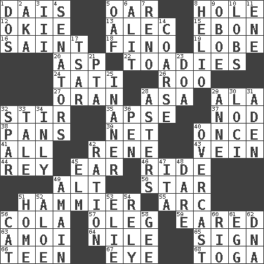ACROSS 1. Raised platform 5. Boat paddle 8. Opening into or through something 12. Migrant worker of the '30s 13. Actor Baldwin 15. Inky black, to poets 16. Inhabitant of Heaven 18. Fine (Spanish) 19. Ear part 20. Cleo's killer 22. Sycophants 24. Jacques of French films 26. Friend of Pooh 27. NW Algerian seaport 28. White ___ sheet 29. Wing 32. Use a swizzle stick 35. Domed church section 37. Dreamland 38. Baking dishes 39. Fish or hair follower 40. Single time 41. Everything 42. French philosopher Descartes 43. Distinctive style or manner 44. Marina Del _, California 45. Ewer handle 46. Travel on an animal 49. Keyboard modifier key 50. Play the lead 51. More given to overacting 55. Curve 56. Root beer relative 57. Cassini of fashion 59. Having ears or earlike features 63. Mine, in Marseilles 64. "Death on the ____" 65. Omen 66. Adolescent 67. Sight organ 68. Ancient Roman robe DOWN 1. Two (Sp.) 2. Alias (abbr.) 3. One more than two 4. Elected representatives 5. Clumsy lout 6. Came down and settled, as after flight 7. Former U.S. Attorney General Janet 8. Sun: prefix 9. Mitch Miller's instrument 10. Tennis shots 11. Compass dir. 14. Unrefined 17. Russian ruler of old 21. Parent Teacher Assoc. 23. ___ good deed 25. More empty; more void 28. Michaelmas daisies 29. Singer Murray 30. Venues 31. Arabian gulf 32. Practice fight 33. Lie 34. Inwardly 36. Writing instrument 40. Cloudy 42. Food allowance for one day 45. Shade tree 47. Call ___ day 48. Have the gumption 49. At full speed 51. Residence 52. Medicinal plant 53. Writer Wiesel 54. Trust 56. Domesticated feline 58. Turn to the right 60. _ de Janeiro 61. Ovum 62. Heredity factor (abbr.)