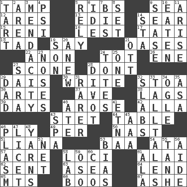 ACROSS 1. Pack (down) 5. Teases 9. Ocean 12. Ancient Greek god of war 13. Singer Brickell 14. Burn superficially 15. Painter Guido (1575-1642) 16. For fear that 17. Jacques of French films 18. Bit 19. Declare 21. Fertile tracts in a desert 22. At once, immediately (arch.) 24. Small child 26. Compass dir. 27. Biscuitlike quick bread 28. Do not 29. Raised platform 30. Compose 32. Portico 36. Johnson of "Laugh-In" 37. "___ Maria" 38. Straggles 39. 24-hour periods 40. Came up 42. Silent film actress Nazimova 43. Proofreading order 44. Eating place 46. Apply oneself diligently 49. For each 50. Political cartoonist Thomas 51. Woody, climbing, usually tropical plant 53. Sound made by sheep 54. "One Day ___ Time" 57. Land measure 58. Event scenes 61. Jai ____ 62. Emitted 63. Toward the sea 64. Grant temporary use of 65. Mountains (abbr.) 66. Expressions of contempt or scorn 67. American tennis player Robert DOWN 1. Small pie 2. Length times width 3. Ananias' fault 4. 23rd letter of the Greek alphabet 5. Depend 6. Binary compound 7. Twice 8. Put into a specified state 9. Gospel singer Marvin 10. Eroded 11. Ascend 14. R.R. building 19. Male offspring 20. Afresh 21. Baseball player Mel 23. Olfactory organs 24. Lugs 25. Single 27. "Two Mules for Sister ____" 28. A piece of turf (Scot.) 29. June honoree 31. More valued for its uncommonness 32. Broad, flat, thick pieces 33. Baron Munchausen's specialties 34. Stare at amorously 35. White ___ sheet 40. Had dinner 41. Inactive volcano in Sicily 43. Health resort 45. American Automobile Association (abbr.) 46. Suffix with ecto or cyto 47. It is permitted: Lat. 48. Tall tales 52. Fish or hair follower 53. Prejudice 55. Hyperbolic tangent 56. Assistant 58. Experiment locale 59. Bear (Spanish) 60. Corporate head (abbr.) 61. In the manner of