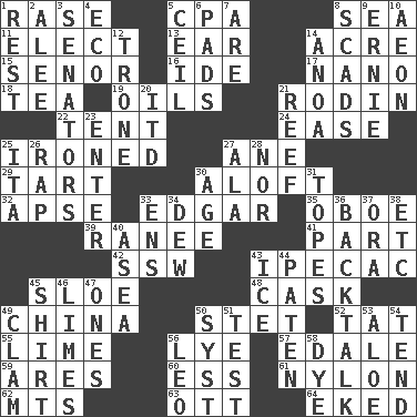 ACROSS 1. To erase 5. Numbers guy (abbr.) 8. Ocean 11. Voters do this 13. Hearing organ 14. 43,560 square feet 15. Sir (Sp.) 16. Binary compound 17. Billionth: prefix 18. Afternoon social gathering 19. Lubricates 21. "The Thinker" sculptor 22. Portable shelter 24. Comfort 25. Pressed 27. One (Scot) 29. Small pie 30. Upward 32. Domed church section 33. _ Allan Poe 35. Mitch Miller's instrument 39. Indian princess (variant) 41. Component 42. Compass dir. 43. Medicinal drug used to evoke vomiting 45. A type of plum 48. Keg 49. Large country 50. Proofreading order 52. Make lace 55. Welles in "The Third Man" 56. Sodium hydroxide 57. Peak District village in England 59. Ancient Greek god of war 60. Double-curved letter 61. Thermoplastic polyamide 62. Mountains (abbr.) 63. Baseball player Mel 64. Supplemented with great effort DOWN 1. State of inaction 2. Toward shelter 3. Legislators 4. Environmental prefix 5. To provide with a ceiling 6. Writing tablets 7. "We ___ not amused" (Victoria) 8. Oodles 9. Bert's buddy 10. Period of immesurable duration 12. Heavy duty weighing machine 14. Small Philippine buffalo 20. It would 21. Coral ridge 23. Keyboard key 25. Call ___ day 26. Reproach for some lapse or misdeed 27. According to 28. Or not 30. Grow older 31. Drinks excessively 33. Followers of ems 34. Morning condensation 36. Sass 37. Mouth or opening 38. And so on (abbr.) 40. At sea 43. Frozen water 44. Eucharist need 45. Upper-body garment 46. Citrus fruits 47. Singles 49. Burrowing marine mollusk 50. System (abbr.) 51. Trial 53. Medicinal plant 54. Be inclined (to) 56. Lion 58. Color