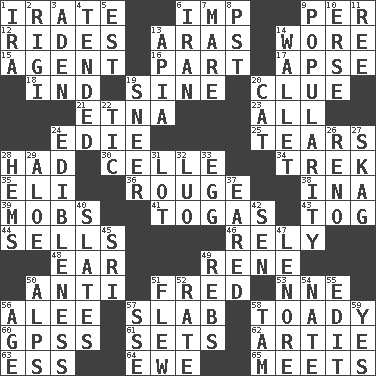 ACROSS 1. Feeling or showing extreme anger 6. Mischievous child 9. For each 12. Amusement-park features 13. Caspian sea tributary 14. Had on 15. Representative 16. Piece 17. Domed church section 18. Indiana (abbr.) 19. Trig term 20. A slight indication 21. Inactive volcano in Sicily 23. Everything 24. Singer Brickell 25. Lacerates 28. Possessed 30. Cell (Danish) 34. Long journey 35. Connecticut Ivy Leaguer 36. Makeup applied to the cheeks 38. _ tizzy (2 wds.) 39. Crowds into 41. Ancient Roman robes 43. Coat; cloak 44. Makes a sale 46. Have trust in 48. Ewer handle 49. French philosopher Descartes 50. Opposed to 51. Flintstone 53. Compass dir. 56. Toward shelter 57. Broad, flat, thick piece 58. Sycophant 60. Global Positioning Systems (abbr.) 61. Arranges properly for use 62. Nick name for Arthur 63. Curvy letter 64. She-sheep 65. Confronts DOWN 1. Retirement account (abbr.) 2. Swiss mountan, "Queen of the Mountains" 3. Arabian gulf 4. Watched over 5. Eastern Standard Time (abbr.) 6. SW Asia republic 7. Female horse 8. Pacific Standard Time (abbr.) 9. Teen's desire 10. Celtic language 11. To separate or throw off 13. Capital of Western Samoa 14. Place for singles 19. Contemptuous expression 20. Domesticated feline 22. Nervous spasm 24. The property of being fit to eat 26. Western Nevada city 27. Heroin 28. Is hesitant and indecisive 29. Medicinal plant 31. Car dealer's back yard 32. Nilotic language 33. Ovum 37. Having ears or earlike features 40. Chalkboards 42. Elected rep. 45. _ Lanka 47. Poe poem 49. Confederate soldiers (slang) 50. High mountains 51. Soared 52. Assign a rank or rating to 54. Nathan's nickname 55. Prepare for publication 56. Ripen 57. Compass dir. 58. Scottish cap 59. It is so