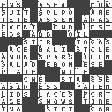 ACROSS 1. Followers of ems 4. At sea 8. Cut the grass 11. Set of matching outer garments 13. Twentieth part of a lira 15. "We ___ not amused" (Victoria) 16. Wig 17. NE Netherlands city 18. Ancient river in northeast Turkey 19. Happening 21. Conclusion 22. For fear that 23. Greek goddess of the dawn 24. Increase 27. Petroleum 29. Commotion 30. Ancient Roman robes 34. Adept person 36. Indonesian resort city 39. Fur scarf 40. Soon (poet.) 41. Practice fights 43. Adolescent 44. Vegetable dish 46. Inky black, to poets 47. Compass dir. 48. Food holder 49. The longest river in the world 51. Single 53. R.R. building 54. Compass dir. 57. SW Saudi Arabia district 60. Curvy letter 63. Eucharist need 65. Hats (slang) 66. Shoestrings 69. Left side of a ship or aircraft 70. Personal question 71. Overwhelms 72. Hoop that covers a wheel 73. _ tizzy (2 wds.) 74. Proofreading order 75. Automobile DOWN 1. First name in cosmetics 2. New (sp.) 3. Settings 4. White ___ sheet 5. Distress signal 6. Otherwise 7. Arabian gulf 8. Female horse 9. Mouths or openings 10. 270 degrees 12. Nine, plus one 14. Southwest Nigerian state 18. One to whom something is allotted 20. Make lace 25. Claim 26. Window treatment 28. It is 29. Elected representatives 31. Leaves 32. Toward shelter 33. Elected rep. 34. Of or related to the anus 35. Root beer relative 37. Experiment locale 38. Metal shackles 40. Viper 42. In a ____ (agitated or irritated) 45. Lair 50. Pet locale 52. Snakelike fish 54. Unemotional 55. Father Junipero _ 56. Keyboard key 57. Jai ____ 58. Public display of a written message 59. It may be bright or harebrained 61. Without 62. Native of Scotland 64. Fitting 67. She-sheep 68. Fast jet (abbr.)