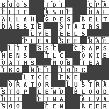 ACROSS 1. Expressions of contempt or scorn 5. Small child 8. Tax preparer (abbr.) 11. Writer Wiesel 12. American tennis player Robert 14. Actor Linden 15. Assad's deity 17. Moves 18. Waist strap 19. Hyrax 21. Flight of steps 23. Sodium hydroxide 25. Snakelike fish 26. Entreaty 27. Perceive with the eye 28. Actress Charlotte 31. Cards in a Roman deck? 33. Compass dir. 35. Dice game 37. Coop moms 38. Affectionate concern, for short 40. Migrant worker of the '30s 41. Profane or obscene expressions 43. Disorderly crowd 45. Beverage made from leaves 46. Ring climax 47. Fish or hair follower 50. Torque (variant) 52. Louse (plural) 53. She-sheep 54. Speaker 56. A period of five years 61. Halt 62. Grant temporary use of 65. Vital fluid 66. Baseball player Mel 67. Inactive volcano in Sicily 68. Inventor's middle name 69. "Barney Miller" actor Jack 70. Car or cant ending 71. Fermented drink made from hops DOWN 1. Necklace unit 2. Spanish pot 3. Petroleums 4. Oceans 5. Label 6. Bear (Spanish) 7. College papers 8. "Mermaids" star 9. Friends 10. The first octave above the treble staff 13. First name in cosmetics 16. Land elevation 18. Twice 20. Sight organs 22. Actor Baldwin 24. Compass direction 26. Expression of disdain 28. Libertine 29. Capital of Western Samoa 30. Compass dir. 31. Path through which fluid escapes 32. To the inside or interior of 34. Shade tree 36. College mil. group 37. Being at a high temperature 39. ____ d'Azur (French Riviera) 42. In a ____ (agitated or irritated) 44. Soup holder 48. Learning spot: Fr. 49. Cigar-shaped 51. Reuben's nickname 52. Pet locale 54. "Beetle Bailey" pooch 55. Printing process, for short 57. Broad, flat, thick piece 58. Lacquered or enameled metalware 59. Be footloose 60. The sixth month of the Jewish calendar 61. Distress signal 63. Compass dir. 64. One of the 12 tribes of Israel