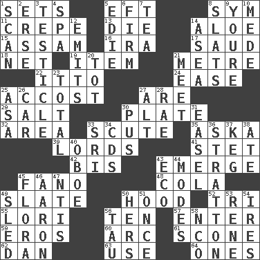 ACROSS 1. Puts into a specified state 5. Lizard (obsolete) 8. Symbol (abbr.) 11. Streamer paper 13. Pass on 14. Medicinal plant 15. Indian state 16. Retirement account (abbr.) 17. Saudi Arabian king (1953-1964) 18. Fish or hair follower 19. A distinct part 21. Distance measurement (Brit.) 22. "Tell ____ the Marines!" 24. Comfort 25. Buttonhole 27. "We ___ not amused" (Victoria) 29. Table seasoning 30. Food holder 32. Type of rug 33. Snake scale 35. "____ silly question..." 39. Titled peers of a realm 41. Proofreading order 42. Again 43. Develop 45. Papal veil 48. Root beer relative 49. Schedule 50. Parka part 52. Three (prefix) 55. Australian parrot (variant) 56. "___ Little Indians" 57. Keyboard key 59. Greek god of love 60. Curve 61. Biscuitlike quick bread 62. One of the 12 tribes of Israel 63. Purpose 64. Singles DOWN 1. Skim 2. Celtic language 3. One of the two male reproductive glands 4. Health resort 5. Singer Brickell 6. Securely fixed in place 7. Afternoon social gathering 8. Narrow boards 9. You are 10. Ancient Persian 12. Gives off 14. At sea 20. Small child 21. Rendezvous 23. Add up to 25. White ___ sheet 26. 4-wheeled motor vehicle 27. Keyboard modifier key 28. Actress Charlotte 30. Tenth month of the Hindu calendar 31. Artist's stand 33. _ Lanka 34. Music discs 36. Ski resort town in Vermont 37. Barrel 38. Had dinner 40. Mitch Miller's instrument 43. Environmental prefix 44. Methods 45. Plants 46. Composer Copland 47. Nuclear Threat Initiatives 49. Downhill vehicle 50. Possessive pronoun 51. Single time 53. French philosopher Descartes 54. Angers 56. The 19th letter of the Greek alphabet 58. Non-commissioned officer (abbr.)
