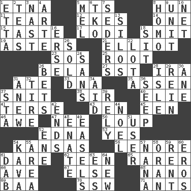ACROSS 1. Inactive volcano in Sicily 5. Mountains (abbr.) 8. Attila the _ 11. Rend 12. Supplements with great effort 14. Single 15. Clothes sense 17. Farming town in central California 18. Stricken, poetically 19. Michaelmas daisies 21. American author Paul (1891-1958) 23. Distress signal 25. Carrot, for example 26. Actor Lugosi 27. Fast jet (abbr.) 28. Lyricist Gershwin 31. Had dinner 33. Heredity factor (abbr.) 35. NE Netherlands city 37. In a ____ (agitated or irritated) 38. Title for a knight 40. Writer Wiesel 41. Laconic 43. Lair 45. Car or cant ending 46. Deep reverence 47. Born 50. Central Nebraska county 52. Pulitzer Prize-winning author Ferber 53. Affirmative reply 54. Sunflower state 56. Poe poem 61. Have the gumption 62. Adolescent 65. More uncommon 66. "___ Maria" 67. Otherwise 68. Billionth: prefix 69. Sound made by sheep 70. Compass dir. 71. Pismires DOWN 1. Singer James 2. Afternoon social gatherings 3. Political cartoonist Thomas 4. Johnson of "Laugh-In" 5. Cartoonist voice _ Blanc 6. Ring climax 7. Spring feasts 8. Like (prefix) 9. A single undivided whole 10. Fish or hair follower 13. Grain storage towers 16. Celtic language 18. Be seated 20. Exchanged or delivered for money 22. Globular water bottle used in Asia 24. Without 26. Wagers 28. Capri or Wright 29. It's straight from the horse's mouth 30. One (Scot) 31. Afresh 32. Hoop that covers a wheel 34. Help 36. Ooze 37. R.R. building 39. Have confidence or faith in 42. Conclusions 44. Christmas carol 48. Maternal 49. Artist's stands 51. One who makes use of a thing 52. Compass dir. 54. Polynesian shrub of the pepper family 55. Type of rug 57. Nanny 58. Northwest Algerian city 59. Monthly bill 60. Greek god of love 61. Apply (a substance) by light strokes 63. Double-curved letter 64. ___ Haven, CT