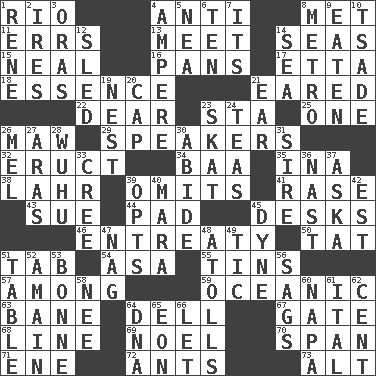 ACROSS 1. River (Sp.) 4. Against 8. Was introduced to 11. Blunders 13. Confront 14. Oceans 15. Actress Patricia 16. Baking dishes 17. Singer James 18. Center 21. Having ears or earlike features 22. Letter starter 23. R.R. building 25. Single 26. Opening into something insatiable 29. Orators 32. Spew [out] 34. Sound made by sheep 35. _ tizzy (2 wds.) 38. Cowardly lion portrayer 39. Leaves out 41. Raze (variant) 43. Institute legal proceedings 44. Writing tablet 45. Writing tables 46. Plea 50. Make lace 51. Keyboard key 54. White ___ sheet 55. Metal containers 57. Amid 59. Pertaining to the sea 63. Object of repulsion 64. Small valley 67. Yard entry 68. Actor's bit 69. Christmas carol 70. Connect, as a bridge 71. Compass dir. 72. Pismires 73. The first octave above the treble staff DOWN 1. French philosopher Descartes 2. Angers 3. Mouths or openings 4. Electrical Unit 5. Teachers' org. 6. Nine, plus one 7. ___ a Wonderful Life 8. Paris' subway 9. Ingested 10. Sadhe (variant) 12. Downhill vehicle 14. Ocean 19. Egg locale 20. Head covering 21. Hearing organ 23. Three-handed card game 24. Afternoon social gatherings 26. Cartoonist voice _ Blanc 27. Ancient river in northeast Turkey 28. Chinese city south-southwest of Nanjing 30. Tolerate 31. Beget 33. Algonquian 36. Political cartoonist Thomas 37. "____ silly question..." 39. Chooses 40. Hindu Mythology: god of death 42. Eastern Standard Time (abbr.) 45. Centimeter-gram-second unit of force 47. Tired old horse 48. Ringlike coral islands and reefs 49. Nervous spasm 51. Eating place 52. At full speed 53. Maid-servant 56. Settles 58. Born 60. California wine valley 61. Slanted text style (abbr.) 62. Penny 64. Heredity factor (abbr.) 65. A really long time 66. Allow