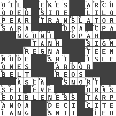 ACROSS 1. Petroleum 4. Supplements with great effort 8. Bowlike part 12. Wrote a lyric poem 14. Beget 15. _ and Stitch 16. Lightbulb-shaped fruit 17. Interpreter 20. "Two Mules for Sister ____" 21. ___ good deed 22. Numbers guy (abbr.) 23. Group of southern Bantu languages 27. Brightly colored fish 29. Hyperbolic tangent 31. Signal 34. Rain (Swedish) 35. Adolescent 36. Method 39. Indian title of respect (Mr.) 41. Capri or Wright 42. Singles 43. Zeal 46. Waist strap 47. Vintage cars 48. At sea 51. Derisive sound 54. Arrange properly for use 56. First lady 58. Mouths or openings 61. The property of being fit to eat 66. Canvas cover 67. Small Philippine buffalo 68. Tenth: prefix 69. Quote 70. Austrian-born American filmmaker Fritz 71. In a ____ (agitated or irritated) 72. Directed DOWN 1. I made a mistake 2. The content of cognition 3. Acquire or gain knowledge or skills 4. Eastern Standard Time (abbr.) 5. Apertif with cassis 6. Period 7. Transmit 8. Wing 9. Actors Guy, Robert Welles, and Clint 10. Hoof sound 11. Israeli folk dance 13. To draw with force 18. "Barney Miller" actor Jack 19. Infant locale 24. Shoshoni 25. Tired old horse 26. Taverns 28. Being in motion 30. Ethiopian city, capital of Harari 32. Set 33. Compass dir. 34. Musical pauses 36. Crowd into 37. Single 38. Accusation by an informer 40. Angers 44. Spanish title 45. Bear (Spanish) 49. Snakelike fish 50. "___ Maria" 52. College mil. group 53. Hang back 54. Lick closed 55. Pulitzer Prize-winning author Ferber 57. Extremities 59. Johnson of "Laugh-In" 60. Broke a traffic law 62. Paper or plastic container 63. Car or cant ending 64. _-fi 65. Be seated