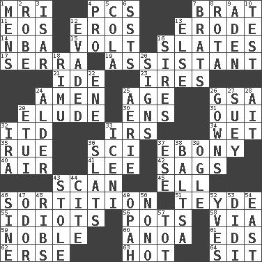 ACROSS 1. Medical imaging device (abbr.) 4. Personal Computers (abbr.) 7. Naughty child 11. Greek goddess of the dawn 12. Greek god of love 13. Wear away 14. Basketball assoc. 15. Electrical Unit 16. Chalkboards 17. Spanish missionary in California 19. Helper 21. Binary compound 23. Angers 24. So be it 25. Ripen 26. Girls' org. (abbr.) 29. Dodge 30. Followers of ems 31. Fr. "Yes" 32. It would 33. Big collection agency 34. Dripping 35. Sorrow 36. _-fi 37. Dark wood 40. Wind 41. Area sheltered from the wind 42. Droops 43. Glance over 45. Pipe bend 46. Decision 51. Miss Universe 1986, Barbara Palacios _ 55. Foolish or stupid persons 56. Plant holders 58. By way of 59. Impressive in appearance 60. Small Philippine buffalo 61. Begley and Asner 62. Celtic language 63. Being at a high temperature 64. Be seated DOWN 1. Not women's 2. Loose flowing garment 3. Austrian river, tributary to the Danube 4. Adept person 5. Root beer relative 6. Fast planes 7. Naughty children 8. Roll call or roster of names 9. Arabian gulf 10. Trial 12. Dodged 13. Otherwise 16. Founders of families 18. Tall New Zealand timber tree 20. Omens 22. Compass dir. 24. Tree or shrub in the Birch family 25. Nest on high 26. Women's formal wear 27. Chop _ 28. Small island 29. Needle case 32. Lyricist Gershwin 33. Ancient Celtic tribe of eastern Britain 36. Narrow boards 37. Compass dir. 38. Greek mezzo-soprano Agnes 39. Stare 43. Took without asking 44. Quote 46. Trig term 47. Scent 48. Chest bones 49. Brightly colored fish 50. Words to Nanette 52. Jacques Cousteau's middle name 53. "You Light Up My Life" star Conn 54. Compass direction 57. Small child