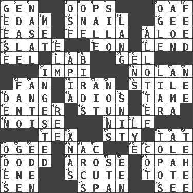 ACROSS 1. Commissioned military rank (abbr.) 4. I made a mistake 8. Clumsy lout 11. Dutch treat 13. Slow-paced one 15. Turn to the right 16. Comfort 17. Man or boy (slang) 18. _ vera 19. Schedule 21. Age 22. Grant temporary use of 23. Snakelike fish 24. Experiment locale 27. Set 29. Body of Kaffir warriors 30. Pitcher Ryan 34. Avid follower 36. SW Asia republic 39. Vertical member of a panel or frame 40. Mild oath, euphamism for damn 41. Goodbye (Sp.) 43. Not wild 44. Keyboard key 46. Surprise greatly 47. Period 48. Annoying sound 49. Mediterranean tributary 51. John Ritter's dad 53. Filthy place 54. Make lace 57. Double curve, resembling the letter S 60. Big _ 63. Learning spot: Fr. 65. Texas town _ City 66. Came up 69. Brightly colored fish 70. Compass dir. 71. Scutum 72. Carryall 73. Elected rep. 74. Connect, as a bridge 75. Perceive with the eye DOWN 1. Honkers 2. Peak District village in England 3. Relating to the nose 4. Order of Saint Francis (abbr.) 5. Single 6. Diluted with white 7. Grain storage tower 8. Stare 9. A really long time 10. Nourish 12. Was introduced to 14. Austrian-born American filmmaker Fritz 18. One to whom something is allotted 20. Shade tree 25. Capital of Western Samoa 26. Avian creatures 28. Followers of ems 29. Consumed 31. One who doesn't tell the truth 32. _ mater 33. Born 34. Papal veil 35. Opposed to 37. Small island 38. Parts of speech 40. Lair 42. In a ____ (agitated or irritated) 45. To separate or throw off 50. Sodium hydroxide 52. Dec. holiday 54. Literary convention 55. Having winglike extensions 56. Giggle 57. Lyric poems 58. Went 59. Paradise 61. Curves 62. Clever action or accomplishment 64. Small bed 67. R.R. building 68. Car or cant ending