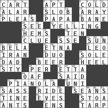 ACROSS 1. Heavy open wagon 5. Fitting 8. Chilled 12. Having or resembling wings 13. Oscar Madison type 15. Like ___ of sunshine 16. Entreaties 18. Dad 19. Object of repulsion 20. Perceive with the eye 22. Crying or shouting loudly 24. Equivocates 26. "___ Little Indians" 27. A slight indication 28. Compass dir. 29. Player for Phoenix 32. Actor Lugosi 35. Inactive volcano in Sicily 37. Lion 38. SW Asia republic 39. Superhero pair 40. Flatfish 41. June honoree 42. Fermented drink made from hops 43. Person who is morally reprehensible 44. Filthy place 45. For each 46. Singer James 49. Clumsy lout 50. Alleged 51. Player piano 55. Single; one (prefix) 56. Backtalk 57. Travel on an animal 59. Actors Connery and Penn 63. Prong on a fork 64. Nights before holidays 65. Portico 66. Pismires 67. Followers of ems 68. Canvas cover DOWN 1. Head covering 2. 100% 3. Actress Charlotte 4. File 13 5. Viper 6. Shaw product 7. Drink excessively 8. Apartment or room in a ship 9. NW Algerian seaport 10. Long (Scottish) 11. Color 14. Greek mezzo-soprano Agnes 17. Stitch closed the eyes of (a falcon) 21. Australian flightless bird 23. Area sheltered from the wind 25. Sowing specialist 28. Sounds asleep 29. _ gin 30. Ubangi River tributary 31. Christmas carol 32. Auction offers 33. Part of Q.E.F. 34. Kenny Rogers chart-topper in '80 36. Third day of the wk. 40. Most questionable 42. Prior to 45. Baking dish 47. The 19th letter of the Greek alphabet 48. Metal containers 49. Fertile tracts in a desert 51. Ache 52. Is not 53. Not recorded 54. Arabian gulf 56. R.R. building 58. Curvy letter 60. _ moment's notice (2 wds.) 61. And not 62. Plant excrement