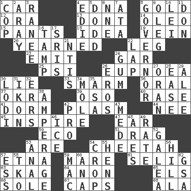 ACROSS 1. Auto 4. Pulitzer Prize-winning author Ferber 8. Aureate 12. Mouth or opening 13. Do not 14. Butter sub 15. Leg coverings 18. The content of cognition 19. Distinctive style or manner 20. Felt deep pity or tenderness 22. Part of a journey 23. Send forth 24. Slender fish 25. 23rd letter of the Greek alphabet 26. Normal relaxed breathing 30. Untruth 33. Excessive but superficial compliments 36. Relating to the mouth 37. Gumbo ingredient 39. Bear (Spanish) 40. Raze (variant) 41. Dormintory (informal) 42. Suffix with ecto or cyto 44. Born 45. Stimulate to action 47. Ewer handle 50. Environmental prefix 51. To be drawn or hauled along 53. "We ___ not amused" (Victoria) 54. Leopard's kin 57. Inactive volcano in Sicily 59. Female horse 61. Former Milwaukee Brewers owner Bud 63. Heroin 64. Soon (poet.) 65. Raised railways 66. Not divided or shared with others 67. Balmoral and tarboosh 68. Insect wing DOWN 1. Police officer (slang) 2. Like ___ of sunshine 3. Indian princess (variant) 4. Singer Brickell 5. Texas town _ City 6. Compass dir. 7. "One Day ___ Time" 8. State head 9. Cassini of fashion 10. Luau accessory 11. Spanish title 16. Pack (down) 17. Indian titles of respect 21. Nuclear Threat Initiatives 22. Infant locale 24. Chewing product 26. Greek god of love 27. NW Algerian seaport 28. Relaxation 29. Toward shelter 30. Farming town in central California 31. Picture 32. Blunders 34. Undercover agent 35. White ___ sheet 38. Electrical Measurement 42. Adept person 43. Ancient Persian 46. Frozen water 48. Ancient Greek god of war 49. Pace 52. An organ shaped like a helmet 53. Of or related to the anus 54. Riding implement 55. Coop moms 56. Land elevation 57. Curvy letter 58. Ring climax 59. Big _ 60. Santa ___, CA 62. Girls' org. (abbr.)