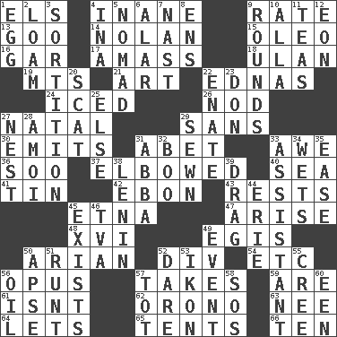 ACROSS 1. Raised railways 4. Empty; void 9. Pace 13. Thick or sticky substance 14. Pitcher Ryan 15. Butter sub 16. Slender fish 17. Collect or gather 18. ____ Bator, Mongolia 19. Mountains (abbr.) 21. Nonscientific branch of learning 22. Ferber et al. 24. On the rocks 26. Lower and raise head in agreement 27. Relating to or accompanying birth 29. Without 30. Gives off 31. Collude with 33. Deep reverence 36. "Barney Miller" actor Jack 37. Shoved, as through a crowd 40. Ocean 41. Metal container 42. Inky black, to poets 43. Musical pauses 45. Inactive volcano in Sicily 47. Get up 48. 16 49. The front part of a cuirass 50. Believer in; advocate of (suffix) 52. HTML Container Element 54. And so on (abbr.) 56. Musical composition 57. Proceeds 59. "We ___ not amused" (Victoria) 61. Is not 62. U. of Maine site 63. Born 64. Allows 65. Portable shelters 66. "___ Little Indians" DOWN 1. Ovum 2. Rich soil 3. Drawing lots 4. _ tizzy (2 wds.) 5. Wanderer 6. Having or resembling wings 7. Political cartoonist Thomas 8. Followers of ems 9. Periods in a boxing match 10. Silent film actress Nazimova 11. Afternoon social gatherings 12. Period of immesurable duration 20. Jazz singing style 22. Maternal 23. Spanish title 25. Otherwise 27. Egg locale 28. Mine, in Marseilles 29. Stitched 31. Swedish rock group 32. Sometimes accompanies a hiss 33. Aide 34. Soaks 35. Comfort 38. Soviet premier 1918-24 39. To draw with force 44. 4th largest of the Great Lakes 45. Has an existence 46. Federal power corp. 49. Incident 50. Domed church section 51. The smallest animal of a litter 52. Have the gumption 53. Image 55. Algonquian 56. Petroleum 57. Small child 58. Distress signal 60. Car or cant ending