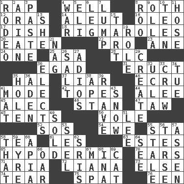 ACROSS 1. Strike 4. Not ill 8. Writer of Portnoy's Complaint (1969) 12. Mouths or openings 14. Eskimo relative 16. Margarine 17. Food container 18. Complicated, petty procedures 20. Consumed 22. Adept person 23. One (Scot) 24. Single 25. White ___ sheet 28. Affectionate concern, for short 30. Mild oath 31. Spew [out] 35. Actor Linden 37. One who doesn't tell the truth 40. Shade of tan 41. Method 42. Drinks excessively 44. Toward shelter 45. Actor Baldwin 46. Comedian Laurel of Laurel & Hardy 47. The 23rd letter of the Hebrew alphabet 48. Portable shelters 50. Short-tailed, large-bodied rat 52. Mayday 54. She-sheep 55. R.R. building 58. Afternoon social gathering 61. French article 63. _____ Park, CO 65. Under the skin 70. Hearing organs 71. Roberta Peters solo 72. Climbing, woody, usually tropical vines 73. Otherwise 74. Pull apart 75. Petty quarrel 76. Car or cant ending DOWN 1. Cowboy competition 2. Believer in; advocate of (suffix) 3. Thick mixture 4. Armed conflict 5. Biblical high priest 6. Part of a journey 7. Mass 8. Friend of Pooh 9. Water jar 10. Adolescent 11. Stockings 13. A female animal or person 15. Small pie 19. Hero or heavy, e.g. 21. Tired old horse 26. Table seasoning 27. Goodbye (Sp.) 29. Make 30. Chooses 32. Southern CA. univ. 33. Ship's personnel 34. Third day of the wk. 35. Hollow 36. An important port of Yemen 38. Fitting 39. Rob, plunder, or pillage 41. Floor covering 43. Frozen precipitation 49. Exchanged or delivered for money 51. Area sheltered from the wind 53. Stitch closed the eyes of (a falcon) 55. Showing deterioration from age 56. Laconic 57. NE Netherlands city 58. Not this but _ 59. Jane of fiction 60. Capital of Western Samoa 62. Indian titles of respect 64. Perceive with the eye 66. Rowing implement 67. Atlas unit 68. _ tizzy (2 wds.) 69. Feline