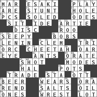ACROSS 1. Third mo. 4. 1973 Nobel Price Winner (Physics) Leo 9. Frolic 13. "We ___ not amused" (Victoria) 14. Check the growth or development of 15. Opening into or through something 16. Personal Computers (abbr.) 17. Having a sole or soles 18. Lyric poems 19. Be seated 21. Binary compound 22. Nick name for Arthur 24. Flat circle 26. Friend of Pooh 27. Not well drained, as in land 29. Moves up and down 30. Soviet premier 1918-24 31. To starve (Brit.) 33. Three (prefix) 36. The grampus (Milton) 37. Leopard's kin 40. Boat paddle 41. Sight organ 42. Pismires 43. Speak pompously 45. Went for two points 47. Methods 48. Actor Linden 49. Cooking vessels 50. Swap 52. R.R. building 54. Baseball player Mel 56. Fermented drink made from hops 57. Erodes 59. Mouth or opening 61. Tear apart 62. Table seasonings 63. Lubricate 64. Singles 65. Obtain by seizing forcibly or violently 66. Car dealer's back yard DOWN 1. Atlas unit 2. Curves 3. Home 4. Double-curved letter 5. Unemotional 6. Old (Scot.) 7. Leg joint 8. It would 9. Pictures 10. Farming town in central California 11. Toward shelter 12. Consenting reply 20. Native american tent (variation) 22. Odor 23. Director Reiner 25. Synchronize (abbr.) 27. A type of plum 28. Suggestive of the supernatural 29. Wagers 31. Penny 32. Allow 33. Inedible or poisonous agaric 34. Assign a rank or rating to 35. Angers 38. White Person, in Hawaii 39. Like (prefix) 44. Printing process, for short 45. Pottery fragments 46. Possessed 49. Components 50. Adolescent 51. French philosopher Descartes 52. Burn superficially 53. Lie 55. Musical group of three 56. Sis' sibling 57. Compass dir. 58. Fast jet (abbr.) 60. The first octave above the treble staff