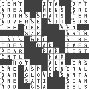 ACROSS 1. Penny 5. Call ___ day 8. Often (poetically) 11. Length times width 12. Not women's 14. Indian title of respect (Mr.) 15. Typical models 17. Arguments over trivial matters 18. "___ Little Indians" 19. Contrary to your interests or welfare 21. Be seated 22. Begley and Asner 23. Area sheltered from the wind 24. Eisenhower's nickname 25. Elected rep. 27. Plant excrement 28. SW Saudi Arabia district 31. Baby powder 35. Set 37. The founder of a family 38. The main thing one is thinking about 39. Male parent 41. Nights before holidays 42. Lightbulb-shaped fruit 43. Infant food 45. For fear that 46. International (abbr.) 47. Atlas unit 49. Being at a high temperature 51. Chicken ___ king 52. Followers of ems 55. Compass dir. 57. Viper 60. Commissioned military rank 62. Tavern 63. Michael Jackson trademark 65. Before Barbara or Clara 66. Single 67. Suttee (variant) 68. Thailand, formerly 69. Lower and raise head in agreement 70. Girls' org. (abbr.) 71. Snakelike fish DOWN 1. Lessep's creation 2. Eat (away) 3. Boldness 4. Docile 5. Mischievous child 6. Beverages made from leaves 7. Against 8. Clearly or manifestly demonstrative 9. Flintstone 10. Metal containers 13. Fast planes 16. Indian titles of respect 17. Oozed 20. Heroin 26. Artist's stand 29. Angers 30. Take ten 31. Native american tent (variation) 32. An important port of Yemen 33. Tough but pliablecoriaceous 34. Monte _, Las Vegas Hotel/Casino 36. Pet locale 40. Break 44. Diluted with white 48. Zero-star reviews 50. Labels 52. Bert's buddy 53. Relating to or accompanying birth 54. Criticizes harshly 55. Inky black, to poets 56. Billionth: prefix 58. Volcanic refuse 59. Plant holders 61. Relaxation 64. By way of
