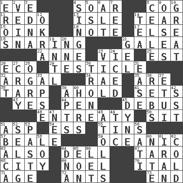 ACROSS 1. Night before a holiday 4. Fly high 8. Gear tooth 11. Redecorate 13. Capri or Wright 14. Rend 15. Pig sound 16. Brief written record 17. Otherwise 18. Catching in a trap 21. An organ shaped like a helmet 22. Queen of England 1702-14 23. Compete 25. Eastern Standard Time (abbr.) 26. Environmental prefix 29. A testis 32. Therefore, facetiously 34. Actress Charlotte 35. "We ___ not amused" (Victoria) 38. Canvas cover 39. Hold, grip (Informal) 41. Puts into a specified state 43. Consenting reply 44. Fenced enclosure 45. To get out of a bus 46. Plea 50. Be seated 51. Viper 54. Curvy letter 55. Canisters 57. Memphis, Tenn. Street 59. Pertaining to the sea 63. In addition 64. Small valley 67. Edible starchy tuberous root 68. Municipality 69. Christmas carol 70. Slanted text style (abbr.) 71. Ripen 72. Pismires 73. Conclude DOWN 1. Greek god of love 2. Distinctive style or manner 3. Pulitzer Prize-winning author Ferber 4. Burns superficially 5. Bear (Spanish) 6. Keyboard modifier key 7. To separate or throw off 8. Cell (Danish) 9. Fertile tracts in a desert 10. Relatively large 12. Gumbo ingredient 14. Afternoon social gathering 19. International (abbr.) 20. Compass dir. 21. Set 23. Small bottle 24. On the rocks 26. Consume 27. Supercomputer manufacturer 28. Legendary monster 30. Heavy duty weighing machine 31. Comfort 33. Domed church section 36. Confederate soldiers (slang) 37. Needle holder 39. Tenement units (abbr.) 40. Possessive pronoun 42. Fast jet (abbr.) 45. Centimeter-gram-second unit of force 47. Born 48. Ringlike coral islands and reefs 49. Nervous spasm 51. Phillipine bananalike plant 52. Major League Baseball Commissioner Bud 53. Thick mixture 56. Suttee (variant) 58. Myrna of the movies 60. Nathan's nickname 61. SW Asia republic 62. Lacking warmth 64. Heredity factor (abbr.) 65. A really long time 66. Allow