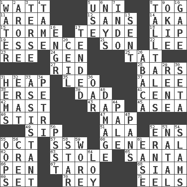 ACROSS 1. Electrical Unit 5. Single; one (prefix) 8. Coat; cloak 11. Length times width 12. Without 14. Alias (abbr.) 15. Singer Mel 17. Miss Universe 1986, Barbara Palacios _ 18. Mouth edge 19. Core 21. Boy, to dad 22. Area sheltered from the wind 23. To sift 24. Commissioned mil. rank 25. Make lace 27. To free from 28. Oblong pieces of solid material 31. Pile 35. Lion 37. Toward shelter 38. Celtic language 39. June honoree 41. Penny 42. Vertical spar for supporting sails 43. Hit sharply and swiftly 45. At sea 46. Agitate 47. Atlas unit 49. Small drink 51. According to 52. Followers of ems 55. Sep. follower 57. Compass dir. 60. Commissioned military rank 62. Mouth or opening 63. Fur scarf 65. Before Barbara or Clara 66. Animal enclosure 67. Pacific island yam 68. Thailand, formerly 69. Put into a specified state 70. Marina Del _, California 71. Snakelike fish DOWN 1. Wetness 2. Came up 3. Laconic 4. Not wild 5. Purpose 6. Negative votes 7. Southeast Asian peninsula 8. Baron Munchausen's specialties 9. Migrant worker of the '30s 10. Stare wonderingly 13. Emitted 16. Engineer (abbr.) 17. Looked after 20. To provide with a ceiling 26. Phillipine bananalike plant 29. French philosopher Descartes 30. Bristle 31. Cloth borders 32. Part of Q.E.F. 33. Aide 34. _ dish (used to culture cells) 36. Boat paddle 40. Break 44. Light colored 48. Baking dishes 50. Inconspicuous attention getter 52. Bert's buddy 53. Brizilian seaport 54. Shuts with force 55. I made a mistake 56. Algonquian 58. Play the lead 59. Had on 61. Relaxation 64. Myrna of the movies