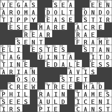 ACROSS 1. Viva Las _ 6. Ocean 9. Car or cant ending 12. Odor 13. Stupid person 14. Southwest Nigerian state 15. Likely to tip or tilt 16. Relaxation 17. Use a spoon 18. Compass dir. 19. Female horse 20. Land measure 21. Buttocks 23. Actress Charlotte 24. Emitted 25. Movie unit 28. Biblical high priest 30. _____ Park, CO 34. Comedian Laurel of Laurel & Hardy 35. Label 36. National forest in Provo, Utah 38. It would 39. Prong on a fork 41. Peak District village in England 43. Curvy letter 44. Believer in; advocate of (suffix) 46. Advice 48. Bear (Spanish) 49. Proofreading order 50. Ship's personnel 51. Woody plant 53. Possessed 56. Silvers or Donahue 57. Water falling in drops from the sky 58. Domesticates 60. Observes 61. Old (Scot.) 62. Ancient Celtic tribe of eastern Britain 63. Big collection agency 64. Sliced dessert 65. 2nd pers. sing. pres. of can (arch.) DOWN 1. Large container 2. 4th largest of the Great Lakes 3. Republicans 4. Electrical Unit 5. Declare 6. Fly high 7. Otherwise 8. Had dinner 9. Pleas 10. Singer Brickell 11. Not either 13. Letter starter 14. Motion picture awards 19. Taiwanese island in East China Sea 20. Sandy's bark 22. Compass dir. 24. Seigniories (variant) 26. Floor protectors 27. Extremities 28. Singer James 29. Den 31. Neckwear 32. Conclude 33. R.R. building 37. Having winglike extensions 40. Artist's stands 42. First lady 45. Immediately 47. New York city 49. Post 50. "Mermaids" star 51. "Change" in Tahitian 52. Cause heat under the collar 54. So be it 55. Hiding places for outlaws 56. 23rd letter of the Greek alphabet 57. Hit sharply and swiftly 58. Nervous spasm 59. Be seated