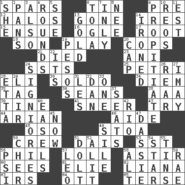 ACROSS 1. Practice fights 6. Shallow baking pan 9. Before (prefix) 12. Saint headwear 13. Went 14. Angers 15. Take place subsequently 16. Stare at amorously 17. Carrot, for example 18. Male offspring 19. Romp 20. 911 reaches them 21. Passed on 23. Black tropical American cuckoo 24. Fast planes 25. _ dish (used to culture cells) 28. Connecticut Ivy Leaguer 30. Twentieth part of a lira 34. South Vietnam president (1954) 35. Label 36. Seines 38. American Automobile Association (abbr.) 39. Prong on a fork 41. Contemptuous expression 43. Attempt 44. Believer in; advocate of (suffix) 46. Assistant 48. Bear (Spanish) 49. Portico 50. Ship's personnel 51. Raised platform 53. Fast jet (abbr.) 56. Silvers or Donahue 57. Hang loosely or laxly 58. Moving about 60. Perceives with the eye 61. Writer Wiesel 62. Woody, climbing, usually tropical plant 63. Big collection agency 64. Baseball player Mel 65. Laconic DOWN 1. A female animal or person 2. Baking dishes 3. In addition 4. Periods in a boxing match 5. Compass dir. 6. Ancient Roman robe 7. Inwardly 8. Born 9. Appease 10. Vintage cars 11. Eastern Standard Time (abbr.) 13. Gilt 14. Pressed 19. Mexican monetary units 20. Head covering 22. ___ a Wonderful Life 24. Seigniories (variant) 26. Buttocks 27. "If ____ say so..." 28. Singer James 29. Den 31. French article 32. One of the 12 tribes of Israel 33. Single 37. Theater features 40. Artist's stands 42. River (Sp.) 45. At this time 47. Small ungulate mammals of Africa 49. Drop; flow; fall 50. "Mermaids" star 51. Stupid person 52. Came down and settled, as after flight 54. Play the lead 55. Airtight sealed metal containers 56. Air pressure measure (abbr.) 57. Lion 58. Keyboard modifier key 59. Actress Charlotte