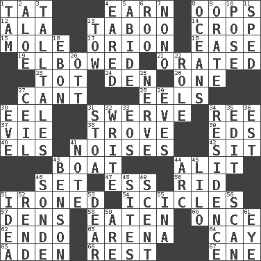 ACROSS 1. Make lace 4. Merit 8. I made a mistake 12. Wing 13. Off limits 14. Riding implement 15. Undercover agent 17. Constellation of myth 18. Comfort 19. Shoved, as through a crowd 21. Spoke pompously 23. Small child 24. Lair 26. Single 27. Patter 28. Snakelike fish 30. Snakelike fish 31. Turn aside suddenly 34. Portuguese money of account (variant) 37. Compete 38. Collection of objects 39. Begley and Asner 40. Raised railways 41. Annoying sounds 42. Be seated 43. Water vessel 44. Set down 46. Put into a specified state 47. Curvy letter 50. To free from 51. Pressed 54. Winter's stalactites 57. Hiding places for outlaws 58. Eroded 60. At one time in the past 62. Inside; within (prefix) 63. Sports stadium 64. Island 65. Arabian gulf 66. Relief 67. Compass dir. DOWN 1. Scottish cap 2. Medicinal plant 3. Baron Munchausen's specialties 4. Having ears or earlike features 5. Remain 6. Friend of Pooh 7. Words to Nanette 8. Seas 9. Speak pompously 10. Introduce or present, as a question 11. Drove too fast 13. Pull behind 16. Inky black, to poets 20. Baseball player Mel 22. Hero or heavy, e.g. 25. Impudent aggressiveness 27. To provide with a ceiling 29. Nights before holidays 30. Night before a holiday 31. Portico 32. Compose 33. Greek goddess of the dawn 34. Dwelling 35. Prepare for publication 36. Eastern Standard Time (abbr.) 41. Musical sound 43. Gillaume's butler role 44. Curve 45. _ and Stitch 46. Message 48. Settings 49. Odor 51. The content of cognition 52. Tear apart 53. Letter starter 55. _ tizzy (2 wds.) 56. Skim 59. "We ___ not amused" (Victoria) 61. Sight organ