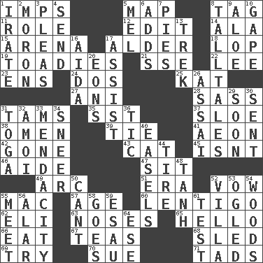 ACROSS 1. Naughty children 5. Atlas unit 8. Label 11. Hero or heavy, e.g. 12. Prepare for publication 14. According to 15. Sports stadium 17. Tree or shrub in the Birch family 18. Trim (branches) 19. Sycophants 21. Compass dir. 22. Area sheltered from the wind 23. Followers of ems 24. Two (Sp.) 25. Krazy ___ of comics 27. Black tropical American cuckoo 28. Backtalk 31. Scottish caps 35. Fast jet (abbr.) 37. _ gin 38. Presage 39. Neckwear 41. Age 42. Went 43. Domesticated feline 45. Is not 46. Helper 47. Be seated 49. Curve 51. Epoch 52. Solemn pledge 55. Apple computer (short form) 57. Personal question 60. Small, flat, pigmented spot on the skin 62. Biblical high priest 63. Olfactory organs 65. Phone greeting 66. Erode 67. Beverages made from leaves 68. Downhill vehicle 69. Attempt to accomplish something 70. Institute legal proceedings 71. Bits DOWN 1. Feeling or showing extreme anger 2. Person of subnormal intelligence 3. Entreaties 4. Transmit 5. Cartoonist voice _ Blanc 6. Sums up 7. Sliced desserts 8. Baron Munchausen's specialties 9. Medicinal plant 10. Open wide 13. Long journey 16. Opera by Verdi 17. Aid 20. Immeasurably long periods of time 26. Slender Brazilian palm 29. Within a short period 30. Posted 31. Ancient Roman robe 32. Mine, in Marseilles 33. Ananias' fault 34. Scornful expression 36. Nervous spasm 40. Artist's stands 44. Hoop that covers a wheel 48. Hyperbolic tangent 50. Patter 52. Country estate 53. Stared 54. Forest 55. Rendezvous 56. Having or resembling wings 58. Travels 59. Son of Isaac 61. Trial 64. Compass dir.