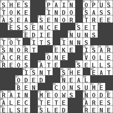 ACROSS 1. "______ My Girl" (Turtles hit) 5. Ache 9. Musical composition 13. Casino tip 14. Southeast Asian peninsula 15. Backtalk 16. Toward the sea 17. Sir (Sp.) 18. Woody plant 19. Core 21. Put into a specified state 22. Singer Brickell 23. Religious women 24. Small child 27. ___ a Wonderful Life 28. Restaurants 29. Derisive sound 31. Make supply last 32. Austrian river, tributary to the Danube 36. Measure of real estate 37. Single 38. Grand slam 39. Vintage cars 40. Had dinner 41. Makes a sale 42. Is not 44. A female animal or person 46. Consume 47. Wrote a lyric poem 48. Actress Patricia 50. Benjamin's nick name 51. Ingest 54. Precipitation 56. Catcalls? 58. Thickened enlargement 60. Actor Baldwin 61. Wig 62. Ancient Greek god of war 63. Otherwise 64. Downhill vehicle 65. French philosopher Descartes DOWN 1. R.R. building 2. Stockings 3. Supplements with great effort 4. Gospel singer Marvin 5. Components 6. Queen of England 1702-14 7. Wedding promise 8. And not 9. Clearly or manifestly demonstrative 10. Components 11. Purpose 12. Compass dir. 17. In a ____ (agitated or irritated) 20. Prepare for publication 21. Player for Phoenix 23. Compass dir. 24. Russian ruler of old 25. Single time 26. "Corrida" creature 28. Mamie's mate 30. Home 31. Compass dir. 33. Flatfish 34. Silent film actress Nazimova 35. Take ten 37. Baseball player Mel 40. Added to 41. Oceans 43. Elected rep. 44. Overwhelmed 45. Coop moms 47. Off-Broadway awards 49. Type of eclipse 51. ____ d'Azur (French Riviera) 52. Greater amount 53. Locale of original sin 54. Actress Charlotte 55. 100% 56. Mountains (abbr.) 57. Snakelike fish 59. Compass dir.