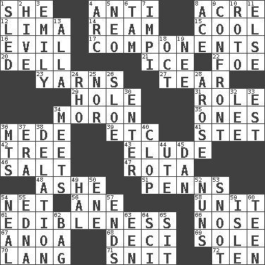 ACROSS 1. A female animal or person 4. Opposed to 8. Measure of real estate 12. Pale green bean 14. 480, 500 or 516 sheets of paper 15. Calm and collected 16. Tending to cause great harm 17. Pieces 20. Small valley 21. Frozen water 22. Enemy 23. Entertaining tales 27. Lacerate 29. Hollow 31. Hero or heavy, e.g. 34. Person of subnormal intelligence 35. Washington bills 36. Ancient Persian 39. And so on (abbr.) 41. Proofreading order 42. Relationship diagram 43. Evade 46. Table seasoning 47. Round or rotation of duties 48. American tennis player Robert 51. Actor Sean's family 54. Fish or hair follower 56. A saturated hydrocarbon 58. A single undivided whole 61. The property of being fit to eat 66. Characteristic smell of wine 67. Small Philippine buffalo 68. Tenth: prefix 69. Flatfish 70. Long (Scottish) 71. In a ____ (agitated or irritated) 72. "___ Little Indians" DOWN 1. Downhill vehicle 2. Hub of activity 3. Poet Dickinson 4. Curve 5. Modern: prefix 6. Scottish cap 7. Body of Kaffir warriors 8. Adept person 9. Meet 10. Printing process, for short 11. Otherwise 13. Silent film actress Nazimova 18. Sep. follower 19. Born 24. 17th letter of the Greek alphabet 25. And not 26. _ gin 28. Came up 30. Keyboard key 32. Area sheltered from the wind 33. Eastern Standard Time (abbr.) 34. Confronts 36. Mountains (abbr.) 37. Epoch 38. Conveyance 40. Hoof sound 44. Shoshoni 45. Daniel's nick name 49. Actor Linden 50. Compass dir. 52. Religious women 53. Snout, nose 54. Actress Patricia 55. Pulitzer Prize-winning author Ferber 57. Extremities 59. Capri or Wright 60. Adolescent 62. Container for groceries 63. Car or cant ending 64. _-fi 65. Be seated