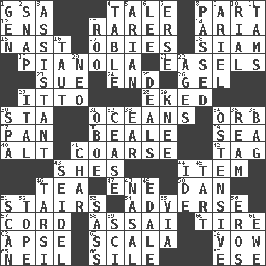 ACROSS 1. Girls' org. (abbr.) 4. Lie 8. Component 12. Followers of ems 13. More uncommon 14. Roberta Peters solo 15. Political cartoonist Thomas 17. Off-Broadway awards 18. Thailand, formerly 19. Player piano 21. Artist's stands 23. Institute legal proceedings 24. Conclusion 26. Set 27. "Tell ____ the Marines!" 28. Supplemented with great effort 30. R.R. building 31. Seas 34. Globe 37. Baking dish 38. Memphis, Tenn. Street 39. Ocean 40. The first octave above the treble staff 41. Unrefined 42. Label 43. "______ My Girl" (Turtles hit) 44. A distinct part 46. Afternoon social gathering 47. Compass dir. 50. One of the 12 tribes of Israel 51. Flight of steps 54. Contrary to your interests or welfare 57. Drawstring 58. Slender Brazilian palm 60. Hoop that covers a wheel 62. Domed church section 63. Any of the three canals of the cochlea 64. Solemn pledge 65. Famous astronaut Armstrong 66. Drop; flow; fall 67. Compass dir. DOWN 1. Commissioned mil. rank 2. Fastener 3. Aide 4. Eating place 5. Believer in; advocate of (suffix) 6. Area sheltered from the wind 7. Celtic language 8. Went by 9. Satellite of Uranus 10. Monetary unit of Yemen 11. Scottish caps 13. Friend of Pooh 16. Pulled tight 20. Modern: prefix 22. Matures 25. Allots cards 27. Slanted text style (abbr.) 29. Leg joint 30. Health resort 31. Mitch Miller's instrument 32. Desist 33. Ewer handle 34. Clearly or manifestly demonstrative 35. 480, 500 or 516 sheets of paper 36. Paper or plastic container 41. Burn to charcoal 43. A glass for beer 44. Binary compound 45. Small pie 46. Tarsus (plural) 48. Rhinal 49. Peak District village in England 51. Examine minutely or intensely 52. Drink excessively 53. Backtalk 55. By way of 56. Greek god of love 59. _-fi 61. She-sheep