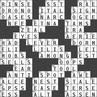 ACROSS 1. Remove soap 6. Fast jet (abbr.) 9. Actress Charlotte 12. U. of Maine site 13. Slanted text style (abbr.) 14. Signal 15. Fertile tracts in a desert 16. Drug cop 17. Double curve, resembling the letter S 18. Born 19. Inactive volcano in Sicily 20. Scottish caps 21. Ardor 23. Period 24. Snake ____ (dice throw) 25. Nest on high 28. Possessed 30. Prying instrument 34. Dormintory (informal) 35. Biblical high priest 36. Ms. Damita and namesakes 38. Flowery wreath 39. Disorderly crowds 41. Amid 43. Eastern Standard Time (abbr.) 44. Makes a sale 46. I made a mistake 48. Ewer handle 49. Utensil 50. Opposed to 51. Blemish 53. Deep reverence 56. Toward shelter 57. Egg locale 58. Lacking originality or spontaneity 60. Global Positioning Systems (abbr.) 61. Relaxation 62. Laconic 63. Double-curved letter 64. The first octave above the treble staff 65. NE Netherlands city DOWN 1. Friend of Pooh 2. SW Asia republic 3. Olfactory organ 4. Dwarf with a sinus problem 5. Greek goddess of the dawn 6. Comedian Laurel of Laurel & Hardy 7. "Two Mules for Sister ____" 8. Affectionate concern, for short 9. Complicated, petty procedures 10. Grows older 11. Compass dir. 13. International (abbr.) 14. Flew 19. Artist's stand 20. Afternoon social gathering 22. Snakelike fish 24. The property of being fit to eat 26. Angers 27. Give off 28. Equivocates 29. _ vera 31. By way of 32. Shade tree 33. River (Sp.) 37. Snout, nose 40. Chalkboards 42. Thick or sticky substance 45. _ Lanka 47. Food holders 49. Haul 50. High mountains 51. Lick closed 52. Inconspicuous attention getter 54. Armed conflicts 55. Otherwise 56. Grow older 57. Teachers' org. 58. R.R. building 59. Car or cant ending