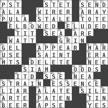 ACROSS 1. Pacific Standard Time (abbr.) 4. Proofreading order 8. Transmit 12. Wing 13. One who wires 14. Like ___ of sunshine 15. Monetary unit of Botswana 17. Having lost freshness 18. Carry 19. Turned at an angle; bent 21. Dodged 23. Teat (slang) 24. Ocean 26. "We ___ not amused" (Victoria) 27. Electrical Unit 28. Smile widely 30. Set 31. Become visible 34. Make imperfect 37. Purpose 38. Virtuous person 39. Epoch 40. Mountains (abbr.) 41. Keyboard key 42. Born 43. Thailand, formerly 44. Probability 46. It would 47. Compass dir. 50. Teachers' org. 51. Put through a sieve 54. Substance 57. One who doesn't tell the truth 58. Having winglike extensions 60. Drop; flow; fall 62. Johnson of "Laugh-In" 63. Eucharist need 64. Metal container 65. Fermented drink made from hops 66. Domed church section 67. Consenting reply DOWN 1. Infant food 2. Change direction abruptly 3. Baron Munchausen's specialties 4. Settings 5. Exchange 6. Snakelike fish 7. Woody plant 8. Titan orbits this 9. Eat (away) 10. Nathan's nickname 11. Colored 13. Compass dir. 16. "This won't hurt ____!" 20. Baseball player Mel 22. Den 25. Rep 27. 270 degrees 29. Assign a rank or rating to 30. Chewing product 31. Toward the sea 32. Insides of hands 33. Sliced dessert 34. Ananias' fault 35. Ancient Greek god of war 36. Actress Charlotte 41. "You Light Up My Life" star Conn 43. A viewer who gazes fixedly 44. Single 45. Habitations of wild animals 46. Feeling or showing extreme anger 48. Theater features 49. First name in cosmetics 51. Broad, flat, thick piece 52. Become fatigued 53. California wine valley 55. Elected rep. 56. Writer Wiesel 59. Pet locale 61. Followers of ems