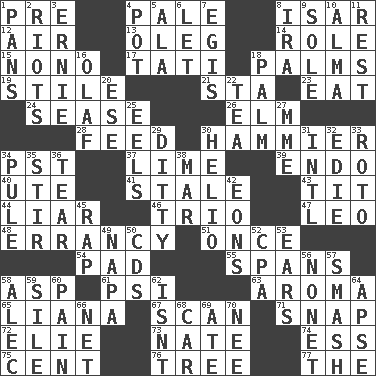 ACROSS 1. Before (prefix) 4. Light colored 8. Austrian river, tributary to the Danube 12. Atmosphere 13. Cassini of fashion 14. Hero or heavy, e.g. 15. Words to Nanette 17. Jacques of French films 18. Insides of hands 19. Vertical member of a panel or frame 21. R.R. building 23. Ingest 24. Gospel singer Marvin 26. Shade tree 28. Nourish 30. More overdramatic by comparison 34. Pacific Standard Time (abbr.) 37. Welles in "The Third Man" 39. Inside; within (prefix) 40. Shoshoni 41. Showing deterioration from age 43. Teat (slang) 44. One who doesn't tell the truth 46. Musical group of three 47. Lion 48. The state or an instance of erring 51. Single time 54. Writing tablet 55. Connects, as a bridge 58. Viper 61. Air pressure measure (abbr.) 63. Scent 65. Woody, climbing, usually tropical plant 67. Examine hastily 71. Fastener 72. Writer Wiesel 73. Nathan's nickname 74. Curvy letter 75. Penny 76. Woody plant 77. Definite Article DOWN 1. Baking dishes 2. Debaucheries 3. Bert's buddy 4. Cooking vessel 5. Chicken ___ king 6. Allow 7. The front part of a cuirass 8. Lyricist Gershwin 9. Flatfish 10. _ mater 11. Take ten 16. Norwegian king 18. Inside of hand 20. Compass dir. 22. Afternoon social gathering 25. Snakelike fish 27. Madame (abbr.) 29. Short, simple song 30. Sun: prefix 31. International (abbr.) 32. Singer Brickell 33. Printing process, for short 34. Whine 35. Use a swizzle stick 36. Lacerate 38. Make imperfect 42. Immeasurably long periods of time 45. Strike 49. California wine valley 50. Music discs 52. Tax preparer (abbr.) 53. Hearing organs 56. Music written for nine 57. Box-office sellout 58. Actor Baldwin 59. Filth; sediment 60. Ache 62. Is not 64. Domed church section 66. Fish or hair follower 68. 4-wheeled motor vehicle 69. Had dinner 70. Born