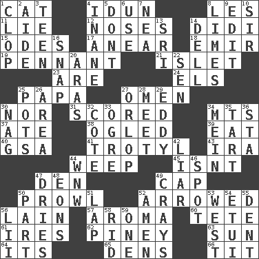 ACROSS 1. Feline 4. Goddess of spring and wife of Bragi 8. French article 11. Whopper 12. Olfactory organs 14. "You Light Up My Life" star Conn 15. Lyric poems 17. Approach 18. Independent ruler or chieftain 19. Pre-World Series prize 21. Small island 23. "We ___ not amused" (Victoria) 24. Raised railways 25. Dad 27. Presage 30. Or not 31. Tallied 34. Mountains (abbr.) 37. Had dinner 38. Stared 39. Erode 40. Girls' org. (abbr.) 41. Trinitrotoluene 43. Retirement account (abbr.) 44. Shed a tear 45. Is not 47. Lair 49. Head covering 50. Move like a hungry wolf 52. Moved like an arrow 56. (Had) reclined 57. Scent 60. False hair 61. Angers 62. Abounding in pines 63. Player for Phoenix 64. It is 65. Hiding places for outlaws 66. Teat (slang) DOWN 1. Hoof sound 2. Helper 3. Adolescent 4. Lacking in sense or substance 5. Do not 6. Purpose 7. Teachers' org. 8. Citrus fruits 9. Prepare for publication 10. Title for a knight 13. _ Lanka 14. Small valley 16. Fastener 20. Ancient river in northeast Turkey 22. Elected rep. 25. Plant holders 26. Type of rug 27. Fourth or lowest deck 28. Confront 29. Whirlpool 30. Tired old horse 32. ____ d'Azur (French Riviera) 33. Legendary monster 34. Count _ (2 wds.) 35. Small pie 36. R.R. building 42. One who doesn't tell the truth 44. Compass dir. 46. Blemish 47. Frees from moisture 48. Immeasurably long periods of time 49. Trading vessels 50. Role in a play 51. Pet locale 52. So be it 53. 270 degrees 54. Needle holder 55. Gouge 56. Cards in a Roman deck? 58. To free from 59. Single