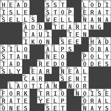 ACROSS 1. Froth on beer 5. Fast jet (abbr.) 8. Farming town in central California 12. Small island 13. Obstruct or block passage 15. Part of Q.E.F. 16. Exchanges for money 18. Not ill 19. Nanny 20. Increase 22. Rending 24. "Change" in Tahitian 26. "___ Little Indians" 27. Visual representation of an object 28. Observe 29. Possessed 32. Grain storage tower 35. High mountains 37. Chief or king in Benin or Nigeria 38. Comedian Laurel of Laurel & Hardy 39. Modern: prefix 40. More than one (prefix) 41. Small boy 42. Make new 43. Lyric poems 44. Mischievous 45. Hearing organ 46. Be tempered by heat 49. 4-wheeled motor vehicle 50. Emitted 51. Of or relating to Laos or its people 55. Or not 56. Tined utensil 57. Musical group of three 59. Annoying sound 63. Pace 64. Sharp bark 65. Relating to the mouth 66. Washington bills 67. Put into a specified state 68. Negative votes DOWN 1. Part of HMS, perhaps 2. Compass dir. 3. Everything 4. Accusation by an informer 5. Compass dir. 6. Proofreading order 7. Lacquered or enameled metalware 8. Soviet premier 1918-24 9. NW Algerian seaport 10. Mild oath, euphamism for damn 11. Call ___ day 14. Food holders 17. Neighbor of Neb. 21. Superhero pair 23. To separate or throw off 25. More lacking in sense or substance 28. Soup utensils 29. Parka part 30. Competent 31. 24-hour periods 32. Fast planes 33. Slanted text style (abbr.) 34. Kenny Rogers chart-topper in '80 36. Directed 40. Characterized by complete cowardliness 42. Noteworthy scarcity 45. Consume 47. Car or cant ending 48. Soon (poet.) 49. Popular sodas 51. Grant temporary use of 52. Johnson of "Laugh-In" 53. Ancient Greek god of war 54. The longest river in the world 56. Away 58. Elect 60. Lyricist Gershwin 61. Declare 62. Raised railways