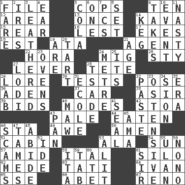 ACROSS 1. Do some clerical work 5. 911 reaches them 9. Nine, plus one 12. Length times width 13. At one time in the past 14. Polynesian shrub of the pepper family 15. Buttocks 16. For fear that 17. Supplements with great effort 18. Eastern Standard Time (abbr.) 19. "One Day ___ Time" 21. Rep 22. Israeli folk dance 24. Russian fighter aircraft 26. Filthy place 27. Prying instrument 28. Wig 29. Old wives' tales, e.g. 30. Trials 32. Introduce or present, as a question 36. An important port of Yemen 37. 4-wheeled motor vehicle 38. SW Saudi Arabia district 39. Auction offers 40. Methods 42. Portico 43. Light colored 44. Ingested 46. R.R. building 49. Deep reverence 50. So be it 51. Small house or cottage 53. Chicken ___ king 54. Player for Phoenix 57. Among 58. Slanted text style (abbr.) 61. Grain storage tower 62. Ancient Persian 63. Jacques of French films 64. _ the terrible 65. Compass dir. 66. Collude with 67. Former U.S. Attorney General Janet DOWN 1. Conductor's collection 2. Angers 3. Resembling or made to resemble leather 4. Hearing organ 5. Root beer relative 6. Single 7. Personal Computers (abbr.) 8. Arrange properly for use 9. Receives possession of 10. Incident 11. Thoroughly unpleasant 14. Barrel 19. "We ___ not amused" (Victoria) 20. Small pie 21. Grow older 23. Baking chambers 24. Distance measurement (Brit.) 25. ___ a Wonderful Life 27. Farming town in central California 28. Sadhe (variant) 29. Experiment locale 31. Learning spot: Fr. 32. Thick mixture 33. Clearly or manifestly demonstrative 34. The Jewish people; Israel 35. Period 40. Informal term for the mouth 41. Lick closed 43. Baking dish 45. Nursemaid (var.) 46. Fraudulent business schemes 47. Domesticates 48. Tolerate 52. Binary compound 53. Came down and settled, as after flight 55. Uhlan (variant) 56. Words to Nanette 58. Call ___ day 59. Keyboard key 60. Had dinner 61. Title for a knight