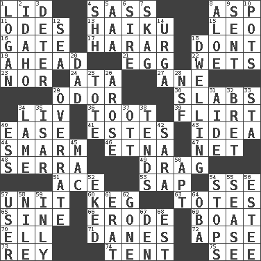 ACROSS 1. Hat (slang) 4. Backtalk 8. Viper 11. Lyric poems 13. Japanese poetic form 15. Lion 16. Yard entry 17. Ethiopian city, capital of Harari 18. Do not 19. Forward in time 21. Oval reproductive body of a fowl 22. Moistens 23. Not either 24. _ moment's notice (2 wds.) 27. One (Scot) 29. Scent 30. Thick slices 34. 54 in ancient Rome 36. A blast of a horn 39. Seductive woman who exploits men 40. Relaxation 41. _____ Park, CO 43. It may be bright or harebrained 44. Excessive but superficial compliments 46. Inactive volcano in Sicily 47. Fish or hair follower 48. Father Junipero _ 49. To draw with force 51. Adept person 53. Plant excrement 54. Compass dir. 57. A single undivided whole 60. Cask 63. Hauls 65. Trig term 66. Eat (away) 69. Water vessel 70. Pipe bend 71. Natives or inhabitants of Denmark 72. Domed church section 73. Marina Del _, California 74. Portable shelter 75. Observe DOWN 1. Utah city north of Ogden 2. Potato state 3. Prevent from occurring 4. Quiet! 5. American Automobile Association (abbr.) 6. Father 7. Heroin 8. Medicinal plant 9. Emitted 10. Plant holders 12. Ocean 14. Capital and largest city of Mongolia 18. Residence 20. Male parent 25. Carry 26. Came up 28. Science/research agcy. 29. Make much ado about nothing 31. Helper 32. Cy Young winner Saberhagen 33. R.R. building 34. Unable to walk 35. Austrian river, tributary to the Danube 37. Baseball player Mel 38. Watches over 40. Curvy letter 42. "Two Mules for Sister ____" 45. Apple computer (short form) 50. Fitting 52. Supplemented with great effort 54. Closes up, plugs up 55. Gospel singer Marvin 56. First name in cosmetics 57. One who makes use of a thing 58. The longest river in the world 59. In an inward manner 61. Part of Q.E.F. 62. Went 64. Chief or king in Benin or Nigeria 67. Lair 68. Eastern Standard Time (abbr.)