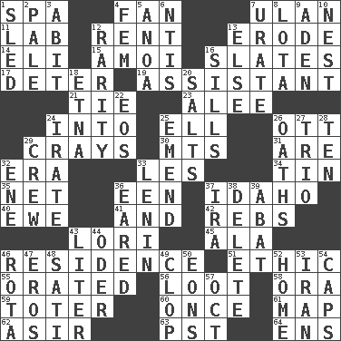 ACROSS 1. Health resort 4. Air blower 7. ____ Bator 11. Experiment locale 12. Monthly bill 13. Wear away 14. Connecticut Ivy Leaguer 15. Mine, in Marseilles 16. Chalkboards 17. Prevent from occurring 19. Helper 21. Standoff 23. Toward shelter 24. To the inside or interior of 25. Pipe bend 26. Baseball player Mel 29. Trading vessels 30. Mountains (abbr.) 31. "We ___ not amused" (Victoria) 32. Epoch 33. French article 34. Metal container 35. Fish or hair follower 36. Car or cant ending 37. Potato state 40. She-sheep 41. Plus 42. Confederate soldiers (slang) 43. Australian parrot (variant) 45. In the manner of 46. Dwelling 51. Moral principle 55. Declaimed 56. Plunder 58. Mouth or opening 59. Carrier 60. Single time 61. Atlas unit 62. SW Saudi Arabia district 63. Pacific Standard Time (abbr.) 64. Followers of ems DOWN 1. Downhill vehicle 2. Light colored 3. "This won't hurt ____!" 4. Opposite of masc. 5. Small Philippine buffalo 6. Nuclear Threat Initiatives 7. A salt of uric acid 8. Globular water bottle used in Asia 9. Arabian gulf 10. A home for chicks 12. Noteworthy scarcity 13. Otherwise 16. Beverly of Met fame 18. Inactive volcano in Sicily 20. Table seasonings 22. Greek goddess of the dawn 24. Feeling or showing extreme anger 25. Make improvements or corrections to 26. Expletives 27. Musical group of three 28. Nine, plus one 29. Group working together 32. Compass dir. 33. Soviet premier 1918-24 36. Having ears or earlike features 37. Lyricist Gershwin 38. Erase 39. Blind as ____ 43. 61 cubic inches 44. River in Europe 46. Roll call or roster of names 47. Greek god of love 48. Suttee (variant) 49. Hoof sound 50. Immeasurably long periods of time 52. Residence 53. SW Asia republic 54. Smile enhancers 57. Sep. follower