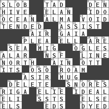 ACROSS 1. Oscar Madison type 5. Small amount or degree 8. Lair 11. Hub of activity 12. Style 14. Wedding promise 15. Sea 17. _ mater 18. Null 19. Looked after 21. Aid 23. Atmosphere 25. Greek goddess of the earth (variant) 26. Entreaty 27. Pipe bend 28. "We ___ not amused" (Victoria) 31. Ocean 33. Russian fighter aircraft 35. Stares 37. Having or resembling wings 38. Overdraft (abbr.) 40. Actor's bit 41. _ pole 43. The 18th letter of the Arabic alphabet 45. Baseball player Mel 46. It is 47. Bear (Spanish) 50. Wander aimlessly 52. SW Saudi Arabia district 53. Java container 54. Erase 56. Sounds asleep 61. Capital of Latvia 62. Writer Wiesel 65. Perfect 66. Biblical high priest 67. Fast planes 68. Otherwise 69. Raised railways 70. Begley and Asner 71. Colored DOWN 1. Went for two points 2. Louse (plural) 3. Baking chamber 4. Necklace unit 5. Beverage made from leaves 6. 100% 7. Break 8. "Vaya con ____" 9. Prepare for publication 10. Dreamland 13. Relating to the nose 16. Anneal 18. By way of 20. South Vietnam president (1954) 22. Grain storage tower 24. Precipitation 26. Piece 28. Came down and settled, as after flight 29. Monthly bill 30. Compass dir. 31. Narrow, elongated depression 32. Hearing organs 34. Girls' org. (abbr.) 36. Seize upon or latch onto something 37. Cuckoo 39. Not soft or yielding to pressure 42. Flexible conduit 44. Horse sense 48. Locates 49. Threatening words 51. Hindu god of fire 52. According to 54. Deli pickle 55. The front part of a cuirass 57. Wrote a lyric poem 58. Have confidence or faith in 59. Comfort 60. Downhill vehicle 61. To separate or throw off 63. It would 64. Curvy letter