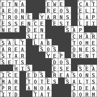 ACROSS 1. Inactive volcano in Sicily 5. She-sheep 8. Feline 11. Age 12. Vintage cars 14. Connecticut Ivy Leaguer 15. Marketplace scale 17. Tall tales 18. Infant locale 19. Core 21. Eastern Standard Time (abbr.) 22. Cards in a Roman deck? 23. Born 24. Lair 25. Plant excrement 27. Be seated 28. Burn to charcoal 31. Table seasoning 35. Experiment locale 37. Heavy book 38. Length times width 39. Mayday 41. Washington bills 42. Play the lead 43. Slangy assent 45. Monthly bill 46. Puts into a specified state 47. Two (Sp.) 49. Part of HMS, perhaps 51. Compass dir. 52. Ocean 55. Frozen water 57. Begley and Asner 60. Thinks logically 62. Make imperfect 63. Hauls 65. Table seasonings 66. Before (prefix) 67. Small Philippine buffalo 68. The main thing one is thinking about 69. It would 70. Make lace 71. Dormintory (informal) DOWN 1. Eroded 2. Laconic 3. Trap for birds or small mammals 4. Singer Murray 5. Period 6. We are 7. Immeasurably long periods of time 8. Portable communications device 9. Jai ____ 10. Native american tent (variation) 13. Fast planes 16. Extremities 17. Gossips 20. To provide with a ceiling 26. Thespian 29. So be it 30. Remainder 31. Backtalk 32. Johnson of "Laugh-In" 33. Resembling or made to resemble leather 34. Tarsus (plural) 36. Male child 40. Spring feasts 44. Introduce or present, as a question 48. Oceans 50. Bristle 52. Twentieth part of a lira 53. Keyboard key 54. Indian state 55. Body of Kaffir warriors 56. Heavy open wagon 58. Do not 59. Portico 61. Stated 64. Consume