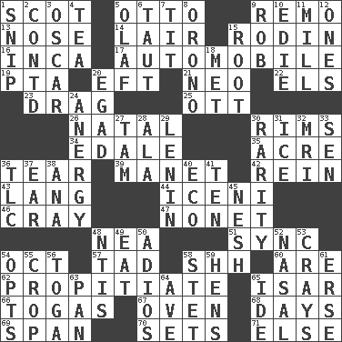 ACROSS 1. Highlander 5. Von Bismarck 9. San ____ (Riviera town) 13. Sense of smell 14. Den 15. "The Thinker" sculptor 16. South American Indian 17. Car 19. Parent Teacher Assoc. 20. Bank Draft (abbr.) 21. Modern: prefix 22. Raised railways 23. To draw with force 25. Baseball player Mel 26. Relating to or accompanying birth 30. Basketball hoops 34. Peak District village in England 35. 1/640 square mile 36. Rend 39. French painter Edouard 42. It's straight from the horse's mouth 43. Austrian-born American filmmaker Fritz 44. Ancient Celtic tribe of eastern Britain 46. Supercomputer manufacturer 47. Music written for nine 48. Teachers' org. 51. Synchronize (abbr.) 54. Sep. follower 57. Bit 58. Quiet! 60. "We ___ not amused" (Victoria) 62. Conciliate 65. Austrian river, tributary to the Danube 66. Ancient Roman robes 67. Baking chamber 68. 24-hour periods 69. Connect, as a bridge 70. Arranges properly for use 71. Otherwise DOWN 1. Clip 2. Continued (abbr.) 3. Motion picture award 4. Beverage made from leaves 5. Norwegian king 6. Tense 7. Teat (slang) 8. U. of Maine site 9. Director Reiner 10. Singer Brickell 11. Place where flour is made 12. Singles 15. Carrot, for example 18. Was introduced to 20. Mild oath 24. Disorder of the immune system 27. Scottish cap 28. According to 29. Soviet premier 1918-24 30. Noteworthy scarcity 31. Frozen water 32. Medical imaging device (abbr.) 33. Elected rep. 36. Affectionate concern, for short 37. Ewer handle 38. Santa ___, CA 40. Environmental prefix 41. "___ Little Indians" 45. Delicate 48. Nuclear Threat Initiatives 49. Erode 50. Goodbye (Sp.) 52. Rhinal 53. Trading vessels 54. Chooses 55. Riding implement 56. Ancient Roman robe 58. Proofreading order 59. Coop moms 61. Celtic language 63. Baking dish 64. "___ Maria" 65. Binary compound