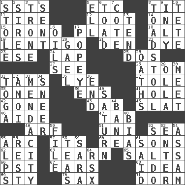 ACROSS 1. Fast planes 5. And so on (abbr.) 8. Teat (slang) 11. Become fatigued 12. Spoils 14. Single 15. U. of Maine site 17. Food holder 18. The first octave above the treble staff 19. Small, flat, pigmented spot on the skin 21. Lair 22. Color 23. Compass dir. 24. Pet locale 25. Two (Sp.) 27. Perceive with the eye 28. Smallest unit of an element 31. Scottish caps 35. Potassium hydroxide 37. Lacquered or enameled metalware 38. Sign of things to come 39. Followers of ems 41. Hollow 42. Went 43. Apply (a substance) by light strokes 45. Narrow board 46. Helper 47. Bar bill 49. Sandy's bark 51. Single; one (prefix) 52. Ocean 55. Curve 57. It is 60. Thinks logically 62. Luau accessory 63. Acquire or gain knowledge or skills 65. Table seasonings 66. Pacific Standard Time (abbr.) 67. Hearing organs 68. The content of cognition 69. Filthy place 70. Saxophone 71. Dormintory (informal) DOWN 1. Took without asking 2. Founders of families 3. Heavy duty weighing machine 4. Emitted 5. Pipe bend 6. Frog relative 7. ____ d'Azur (French Riviera) 8. Inedible or poisonous agaric 9. In an inward manner 10. Wig 13. Watch over 16. Lubricates 17. Wimpy's pal 20. Highlander 26. Expletives 29. Rounded earthenware pot or jar 30. Confront 31. Ancient Roman robe 32. Mine, in Marseilles 33. Ananias' fault 34. Contemptuous expression 36. Conclusion 40. Titan orbits this 44. Object of repulsion 48. Prejudice 50. Do some clerical work 52. Twentieth part of a lira 53. Keyboard key 54. Indian state 55. High mountains 56. Respite 58. Afternoon social gatherings 59. "Two Mules for Sister ____" 61. Alleged 64. Acura sports coupe