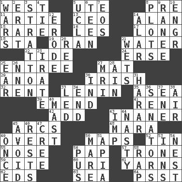 ACROSS 1. Compass direction 5. Shoshoni 8. Before (prefix) 11. Nick name for Arthur 13. Corporate head (abbr.) 14. Actor Alda or Thicke 15. Less widely known 16. French article 17. Yearn 18. R.R. building 19. Northwest Algerian city 21. Wetness 22. Periodic rise and fall of the sea level 24. Celtic language 25. Main course 27. Floor protector 29. Small Philippine buffalo 30. From or relating to Ireland 32. Monthly bill 33. Soviet premier 1918-24 35. At sea 39. Make improvements or corrections to 41. Painter Guido (1575-1642) 42. Say or write further 43. More lacking in sense or substance 45. Arches 48. Hindu Mythology: god of death 49. Unconcealed 50. Atlas contents 52. Metal container 55. Olfactory organ 56. Infant food 57. Heavy duty weighing machine 59. Quote 60. RI univ. 61. Entertaining tales 62. Begley and Asner 63. Ocean 64. Inconspicuous attention getter DOWN 1. Armed conflicts 2. Part of Q.E.F. 3. Ski resort town in Vermont 4. Make a knot 5. Southern CA. univ. 6. Adolescent 7. Greek goddess of the dawn 8. Small pieces of grounds 9. Indian princess (variant) 10. Engineer (abbr.) 12. Wear away 14. Having or resembling wings 20. To riddle 21. Soaks 23. Feeling or showing extreme anger 25. Hearing organ 26. Compass dir. 27. Medical imaging device (abbr.) 28. The 18th letter of the Arabic alphabet 30. Working for oneself (abbr.) 31. Ethiopian city, capital of Harari 33. Directed 34. Conclude 36. Legislators 37. Compass dir. 38. Wind 40. Vertical spar for supporting sails 43. Mischievous child 44. Thoroughly unpleasant 45. Stay clear from 46. Musical pauses 47. Algonquian 49. At one time in the past 50. Female horse 51. Capital of Western Samoa 53. Restaurants 54. A home for chicks 56. Ichor 58. Strike