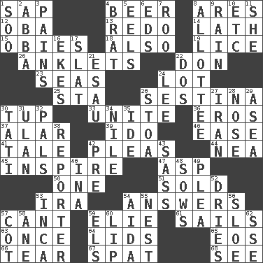 ACROSS 1. Plant excrement 4. Fermented drink made from hops 8. Ancient Greek god of war 12. Chief or king in Benin or Nigeria 13. Make new 14. Thin strip of wood or metal 15. Off-Broadway awards 18. In addition 19. Louse (plural) 20. Short socks 22. Spanish title 23. Oceans 24. Car dealer's back yard 25. R.R. building 26. French poetic form 30. Uncastrated adult male sheep 33. Join together 36. Greek god of love 37. Having or resembling wings 39. Wedding promise 40. Relaxation 41. Falsehood 42. Entreaties 44. Teachers' org. 45. Heighten or intensify 47. Cleo's killer 50. Single 51. Exchanged or delivered for money 53. Retirement account (abbr.) 54. Statements in reply to questions 57. Patter 59. Writer Wiesel 61. Travel by water 63. Single time 64. Hats (slang) 65. Greek goddess of the dawn 66. Rend 67. Argument over a trivial matter 68. Perceive with the eye DOWN 1. "Barney Miller" actor Jack 2. Swedish rock group 3. Aches 4. Naughty child 5. Snakelike fish 6. Begley and Asner 7. Friend of Pooh 8. One to whom something is allotted 9. Precipitation 10. And so on (abbr.) 11. A female animal or person 16. Makes supply last 17. Narrow board 21. He sold his birthright 22. Two (Sp.) 24. Area sheltered from the wind 26. Portico 27. SW Asia republic 28. Characteristic smell of wine 29. At sea 30. Jacques of French films 31. Uhlan (variant) 32. Friends 34. "Death on the ____" 35. Binary compound 38. News announcer 42. Before (prefix) 43. Backtalk 46. _ tizzy (2 wds.) 48. Sty mamas 49. Entreaty 52. Frees from moisture 53. South American Indian 54. Opera by Verdi 55. Egg locale 56. A type of plum 57. Small bed 58. A saturated hydrocarbon 59. Raised railways 60. Mouth edge 62. Compass dir.