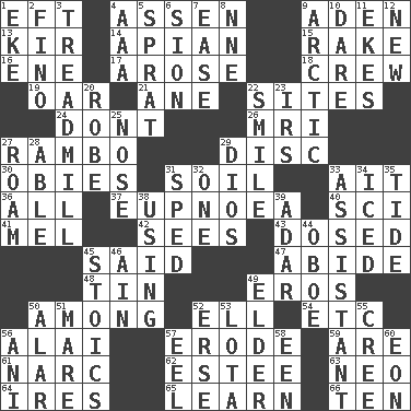 ACROSS 1. Newt 4. NE Netherlands city 9. Arabian gulf 13. Apertif with cassis 14. Bee-related 15. Libertine 16. Compass dir. 17. Came up 18. Ship's personnel 19. Rowing implement 21. A saturated hydrocarbon 22. Locates 24. Do not 26. Medical imaging device (abbr.) 27. Role for Stallone 29. Flat circle 30. Off-Broadway awards 31. The visible part of the earth's surface 33. Small island 36. Everything 37. Normal relaxed breathing 40. _-fi 41. Cartoonist voice _ Blanc 42. Observes 43. Administered medicine 45. Alleged 47. Stay 48. Shallow baking pan 49. Greek god of love 50. Amid 52. Pipe bend 54. And so on (abbr.) 56. Jai ____ 57. Wear away 59. "We ___ not amused" (Victoria) 61. Drug cop 62. First name in cosmetics 63. Modern: prefix 64. Angers 65. Memorize 66. Nine, plus one DOWN 1. Make supply last 2. Fine (Spanish) 3. Excercise machine 4. American Automobile Association (abbr.) 5. Small fatty European fish 6. The Jewish people; Israel 7. Relaxation 8. Compass dir. 9. Northern region 10. Have the gumption 11. Makes supply last 12. ___ Haven, CT 20. Loose flowing garment 22. Grin 23. Big collection agency 25. Olfactory organ 27. Wander aimlessly 28. Competent 29. "Vaya con ____" 31. Drove too fast 32. Single 33. Aide 34. On the rocks 35. Event that recurs at intervals 38. Exploiting 39. The sixth month of the Jewish calendar 44. Mitch Miller's instrument 45. Unemotional ones 46. The 18th letter of the Arabic alphabet 49. A person who is older than you are 50. Having or resembling wings 51. Female horse 52. Celtic language 53. Globular water bottle used in Asia 55. Algonquian 56. Cuckoo 57. Snakelike fish 58. Car or cant ending 60. Age