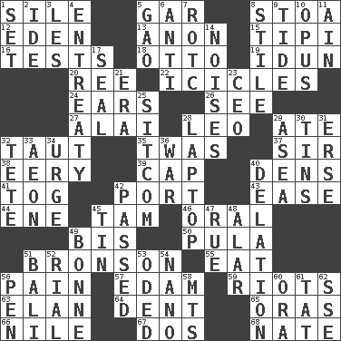 ACROSS 1. Drop; flow; fall 5. Slender fish 8. Portico 12. Locale of original sin 13. Soon (poet.) 15. Native american tent (variation) 16. Trials 18. "Beetle Bailey" pooch 19. Goddess of spring and wife of Bragi 20. To riddle 22. Winter's stalactites 24. Hearing organs 26. Perceive with the eye 27. Mountain range southwest of Kyrgyzstan 28. Lion 29. Had dinner 32. Tense 35. It was, poetically 37. Title for a knight 38. Suggestive of the supernatural 39. Head covering 40. Hiding places for outlaws 41. Coat; cloak 42. Sweet dark-red dessert wine 43. Relaxation 44. Compass dir. 45. Scottish cap 46. Of the mouth 49. Altar cloth linen 50. Monetary unit of Botswana 51. "Death Wish" actor 55. Consume 56. Ache 57. Dutch treat 59. Debaucheries 63. Enthusiasm 64. Scratch 65. Mouths or openings 66. "Death on the ____" 67. Two (Sp.) 68. Nathan's nickname DOWN 1. Put into a specified state 2. Binary compound 3. French article 4. Plea 5. E Mali city 6. Against 7. College mil. group 8. Vertical member of a panel or frame 9. Event that recurs at intervals 10. Musical composition 11. The 18th letter of the Arabic alphabet 14. Annoying sounds 17. Lick closed 21. Epoch 23. Corporate head (abbr.) 25. "Cheers" or "Ellen" 28. Portable computer 29. Toward the sea 30. Canisters 31. Celtic language 32. Wig 33. A really long time 34. Goad 36. Armed conflict 40. Accusation by an informer 42. Went by 45. Metal container 47. Regret 48. Having or resembling wings 49. Child's nurse 51. Indonesian resort city 52. Monetary unit of Yemen 53. Wrote a lyric poem 54. Billionth: prefix 56. Animal enclosure 58. Mountains (abbr.) 60. Mouth or opening 61. Make lace 62. Compass dir.