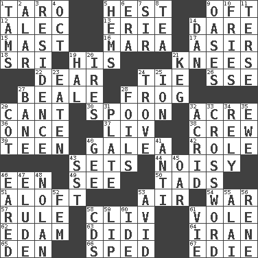 ACROSS 1. Pacific island yam 5. Command 9. Often (poetically) 12. Actor Baldwin 13. One of the Great Lakes 14. Have the gumption 15. Vertical spar for supporting sails 16. Hindu Mythology: god of death 17. SW Saudi Arabia district 18. Indian title of respect (Mr.) 19. Part of HMS, perhaps 21. Leg joints 22. Letter starter 24. Make a knot 26. Compass dir. 27. Calif. Air Force Base 28. Tree-dwelling hopper 29. Patter 30. Soup utensil 32. 1/640 square mile 36. Single time 37. 54 in ancient Rome 38. Group working together 39. Adolescent 40. An organ shaped like a helmet 42. Hero or heavy, e.g. 43. Arranges properly for use 44. Annoyingly loud 46. Car or cant ending 49. Observe 50. Small boys 51. At or to great height 53. Atmosphere 54. Armed conflict 57. Court order 58. 154 in Roman numerals 61. Grand slam 62. Dutch treat 63. "You Light Up My Life" star Conn 64. SW Asia republic 65. Lair 66. Hurried 67. Singer Brickell DOWN 1. Scottish caps 2. Having or resembling wings 3. Home 4. Sep. follower 5. Folds over and sews together 6. Epoch 7. Title for a knight 8. Afternoon social gathering 9. Fertile tracts in a desert 10. Strips of potato fried in deep fat 11. Laconic 14. One of the 12 tribes of Israel 19. Actor Linden 20. Angers 21. Barrel 23. Eroded 24. Collection of objects 25. Electrically charged atom 27. Object of repulsion 28. Fencing necessities 29. Small bed 31. Food holder 32. Bitter 33. What you're doing now 34. Depend 35. She-sheep 40. Turn to the right 41. Against 43. Fast jet (abbr.) 45. Rowing implement 46. Having ears or earlike features 47. Evade 48. Pitcher Ryan 52. Opposite of masc. 53. Enthusiastic 55. Mountain range southwest of Kyrgyzstan 56. French philosopher Descartes 58. Music discs 59. Mouth edge 60. Binary compound 61. Compete