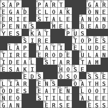 ACROSS 1. Plant excrement 4. Role in a play 8. Slender fish 11. Mild oath 13. Hide under a false appearance 15. Single 16. One of the Great Lakes 17. Lacking originality or spontaneity 18. Soon (poet.) 19. Actor Sean's family 21. Cartoonist voice _ Blanc 22. Necklace unit 23. It is so 24. Krazy ___ of comics 27. Purulenc 29. The founder of a family 30. Drinks excessively 34. Infant locale 36. Jacques of French films 39. Dodge 40. Become fatigued 41. Wear away 43. ____ Bator, Mongolia 44. Standard of perfection 46. Play the lead 47. Scottish cap 48. 1973 Nobel Price Winner (Physics) Leo 49. Flexible conduit 51. Begley and Asner 53. Bear (Spanish) 54. Compass dir. 57. One who doesn't tell the truth 60. Followers of ems 63. Curses 65. Lyric poems 66. Consumed 69. Plunder 70. Modern: prefix 71. Vertical member of a panel or frame 72. Toward shelter 73. Separate the seeds from cotton 74. Celtic language 75. Curvy letter DOWN 1. Not well drained, as in land 2. Match 3. Aches 4. Personal Computers (abbr.) 5. The first octave above the treble staff 6. Wander aimlessly 7. Falsehood 8. Went 9. Small Philippine buffalo 10. Tear apart 12. Lair 14. Seaweed 18. Utter; complete 20. What Jean-Claude Killy likes to do 25. Johnson of "Laugh-In" 26. Lacerates 28. Shoshoni 29. Orators 31. Monetary unit of Botswana 32. Dutch treat 33. Elected rep. 34. Hats (slang) 35. Type of rug 37. Small child 38. Potato state 40. Standoff 42. Greek god of love 45. Hat (slang) 50. "Barney Miller" actor Jack 52. Perceives with the eye 54. Took without asking 55. Imelda's hoard 56. _____ Park, CO 57. Having great length 58. It may be bright or harebrained 59. Period of immesurable duration 61. Nathan's nickname 62. Use a spoon 64. Wing 67. Raised railways 68. Born