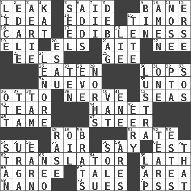 ACROSS 1. Path through which fluid escapes 5. Expressed in words 9. Object of repulsion 13. The main thing one is thinking about 14. Singer Brickell 15. The easternmost of the Lesser Sundas 16. Haul 17. The property of being fit to eat 19. Biblical high priest 20. Raised railways 21. Small island 22. Born 23. Snakelike fish 25. Turn to the right 26. Eroded 30. Chops off 34. New (sp.) 35. To (old English) 36. Von Bismarck 39. Effrontery 42. Oceans 43. Separate forcefully 44. French painter Edouard 46. Docile 47. Navigate 48. Director Reiner 51. Pace 54. Institute legal proceedings 57. Wind 58. Declare 60. Eastern Standard Time (abbr.) 62. Interpreter 65. Thin strip of wood or metal 66. Match 67. Falsehood 68. Type of rug 69. Billionth: prefix 70. Institutes legal proceedings 71. Inconspicuous attention getter DOWN 1. Louse (plural) 2. Peak District village in England 3. Nest on high 4. Krazy ___ of comics 5. Sew up the eyelids of hawks and falcons 6. Does sums 7. One more than two 8. Debunk (Brit. slang) 9. Storage container 10. So be it 11. Olfactory organ 12. Celtic language 15. False hair 18. Untruth 20. He sold his birthright 24. Poe poem 27. "___ Little Indians" 28. Night before a holiday 29. Typical models 30. A period of five years 31. Single 32. Parent Teacher Assoc. 33. Mayday 36. Baseball player Mel 37. Beverage made from leaves 38. Scottish cap 40. Large container 41. Compass dir. 45. Suggestive of the supernatural 48. To erase 49. Petroleum 50. Naughty children 52. Pulls into pieces 53. _____ Park, CO 54. Comedian Laurel of Laurel & Hardy 55. Capital and largest city of Mongolia 56. Merit 58. Flatfish 59. Ancient Greek god of war 61. Not this but _ 63. Modern: prefix 64. The 19th letter of the Greek alphabet 65. Infant locale