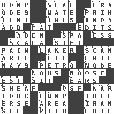 ACROSS 1. Play 5. Lick closed 9. Period 12. Lyric poems 13. Nathan's nickname 14. Demure 15. Portable shelter 16. Angers 17. Small Philippine buffalo 18. Find the sum of 19. Floor protector 21. Proofreads 22. An important port of Yemen 24. Health resort 26. Double-curved letter 27. Any of the three canals of the cochlea 28. Proofreading order 29. Ache 30. Member of a famous L.A. basketball team 32. Examine minutely or intensely 36. Johnson of "Laugh-In" 37. Whopper 38. One of the Great Lakes 39. Negative votes 40. Stone: prefix 42. Thickened enlargement 43. Common sense 44. Trap for birds or small mammals 46. Eastern Standard Time (abbr.) 49. Be seated 50. Hearing organs 51. To gather and bind into a bundle 53. Order of Saint Francis (abbr.) 54. Armed conflict 57. Torque (variant) 58. Mass 61. Lacquered or enameled metalware 62. Celtic language 63. Length times width 64. SW Asia republic 65. Perceive with the eye 66. Heart or essence 67. Singer Brickell DOWN 1. Roll call or roster of names 2. Wrote a lyric poem 3. Ananias' fault 4. Pacific Standard Time (abbr.) 5. In a ____ (agitated or irritated) 6. Ewer handle 7. Had dinner 8. French article 9. Bert's buddy 10. Debaucheries 11. Collect or gather 14. Groovy apt. 19. Cartoonist voice _ Blanc 20. Of or related to the anus 21. Consume 23. Natives or inhabitants of Denmark 24. Bull 25. For each 27. "Two Mules for Sister ____" 28. Burlesque acts 29. Baking dish 31. Native American of Southwest Alaska 32. Sir (Sp.) 33. What you're doing now 34. Helper 35. Born 40. Luau course 41. Singles 43. Science/research agcy. 45. Clumsy lout 46. _____ Park, CO 47. Dinah or Pauly 48. Laconic 52. Adept person 53. Brightly colored fish 55. Mountain range southwest of Kyrgyzstan 56. French philosopher Descartes 58. Pet locale 59. RI univ. 60. Was introduced to 61. Standoff